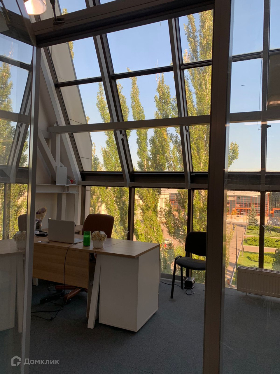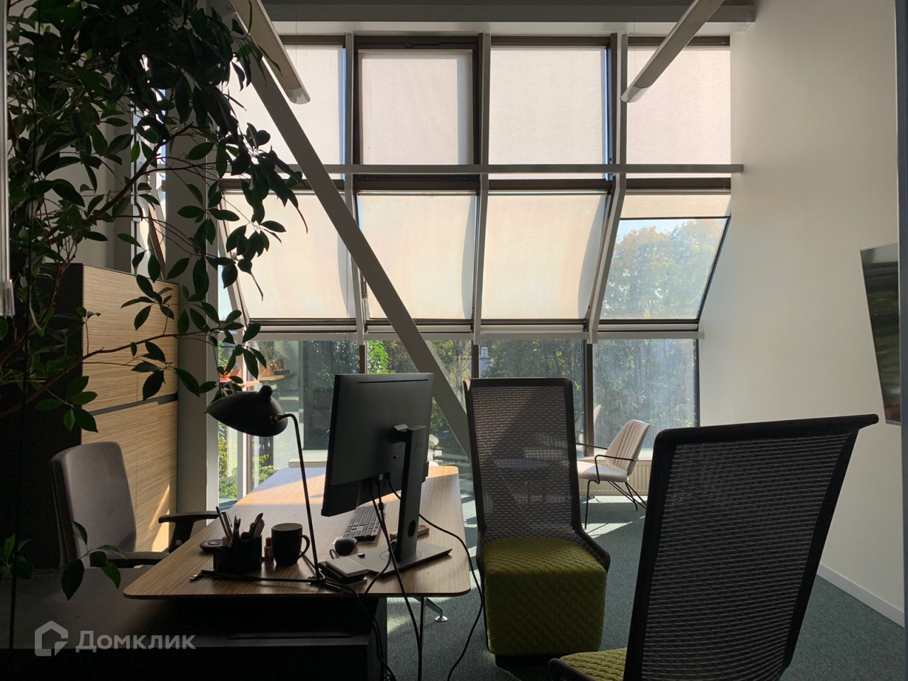 Мансардный этаж, окна в пол, шикарный вид на парк, дизайнерская мебель и много зелени.