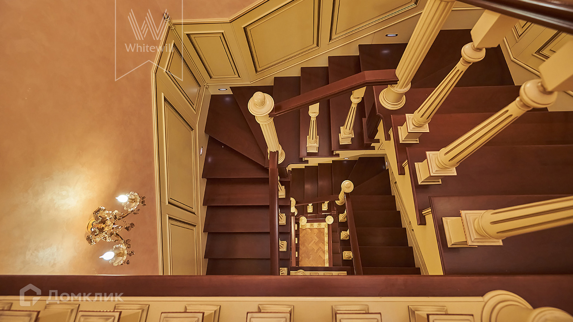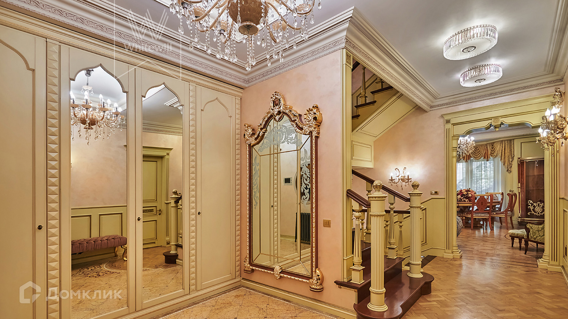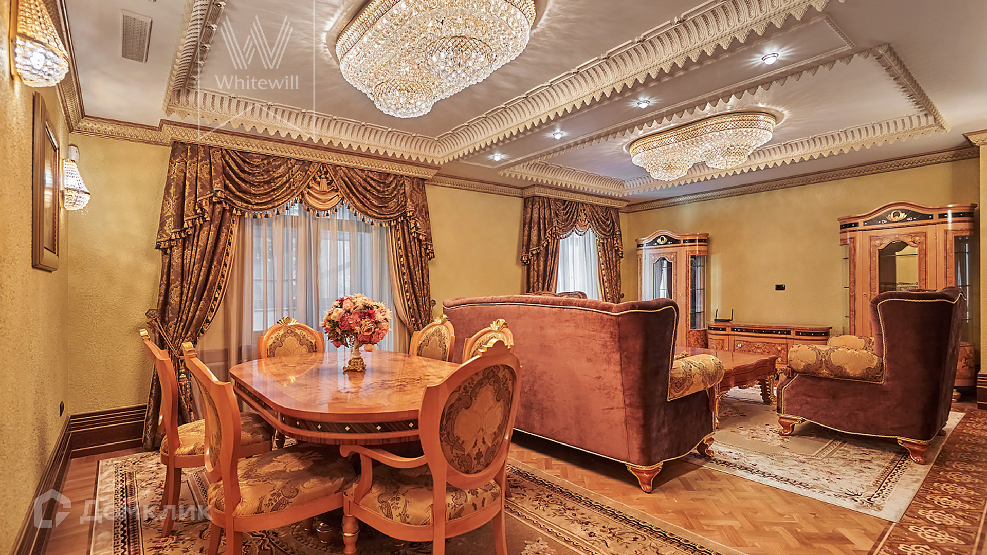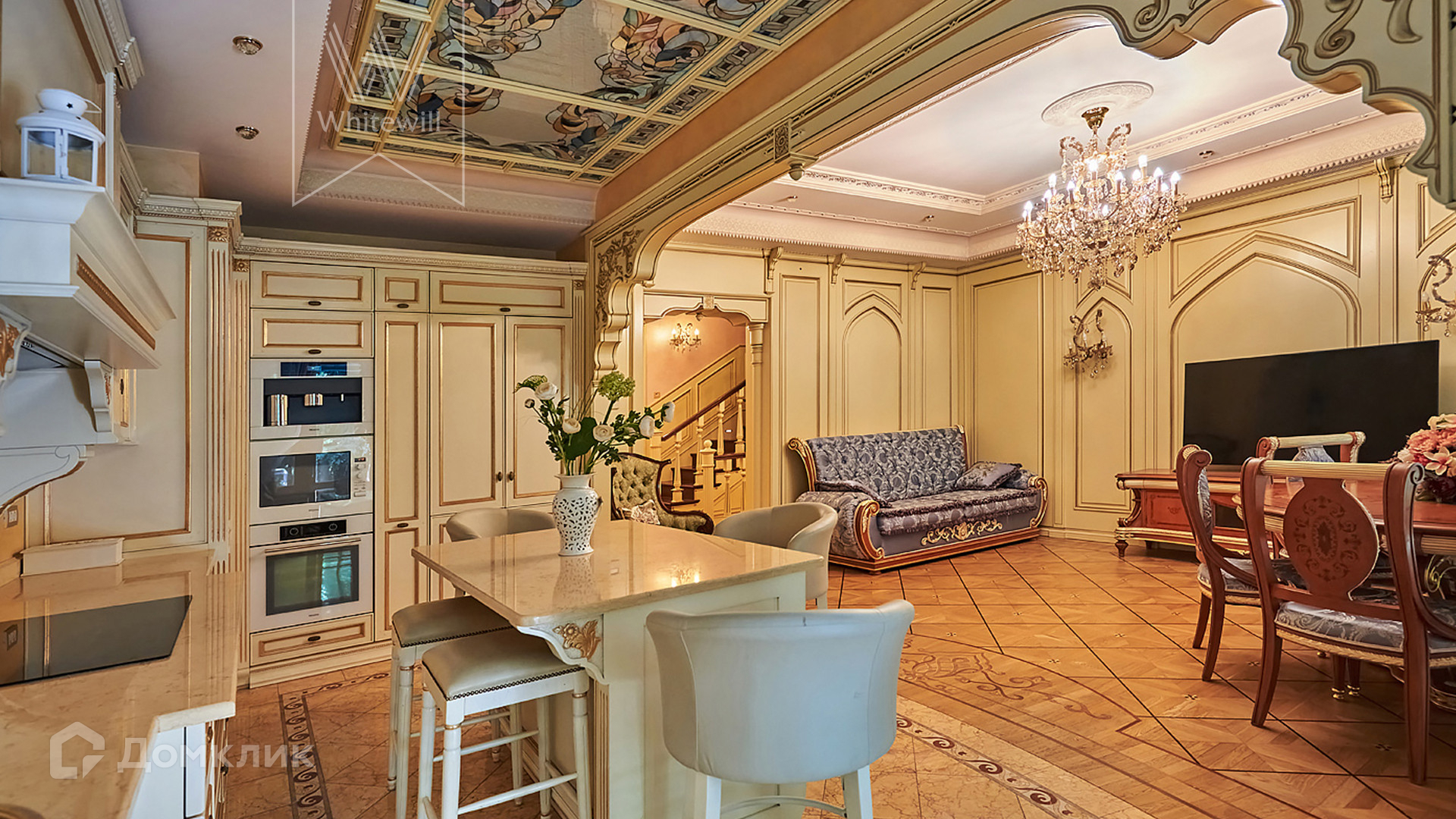 ID 854. С коллегами работаем 50/50. Трёхэтажный таунхаус площадью 323 м² в комплексе премиум-класса «Золотые Ключи-2» рядом с природным парком реки Раменки. Таунхаус включает три этажа, мансарду и подземный этаж. Выполнена премиальная отделка в стиле дворцовой классики. В отделке использованы ценные породы дерева, интерьер украшен лепниной и витражами.