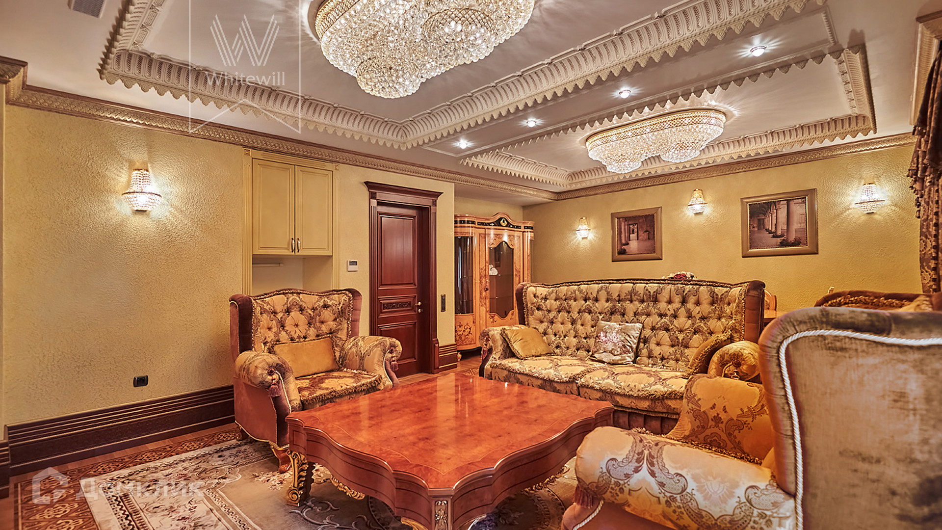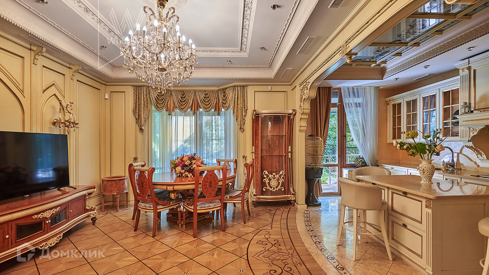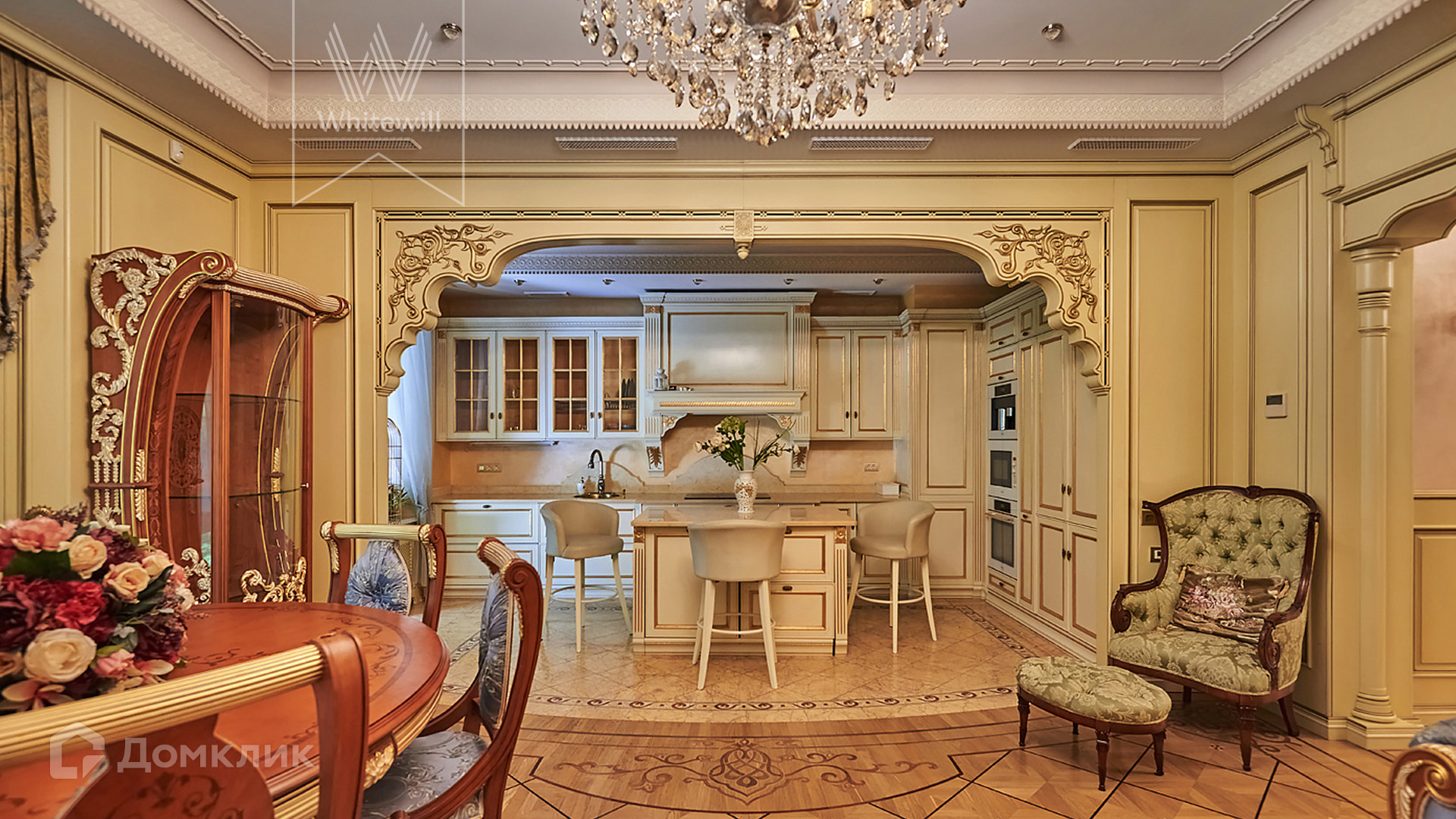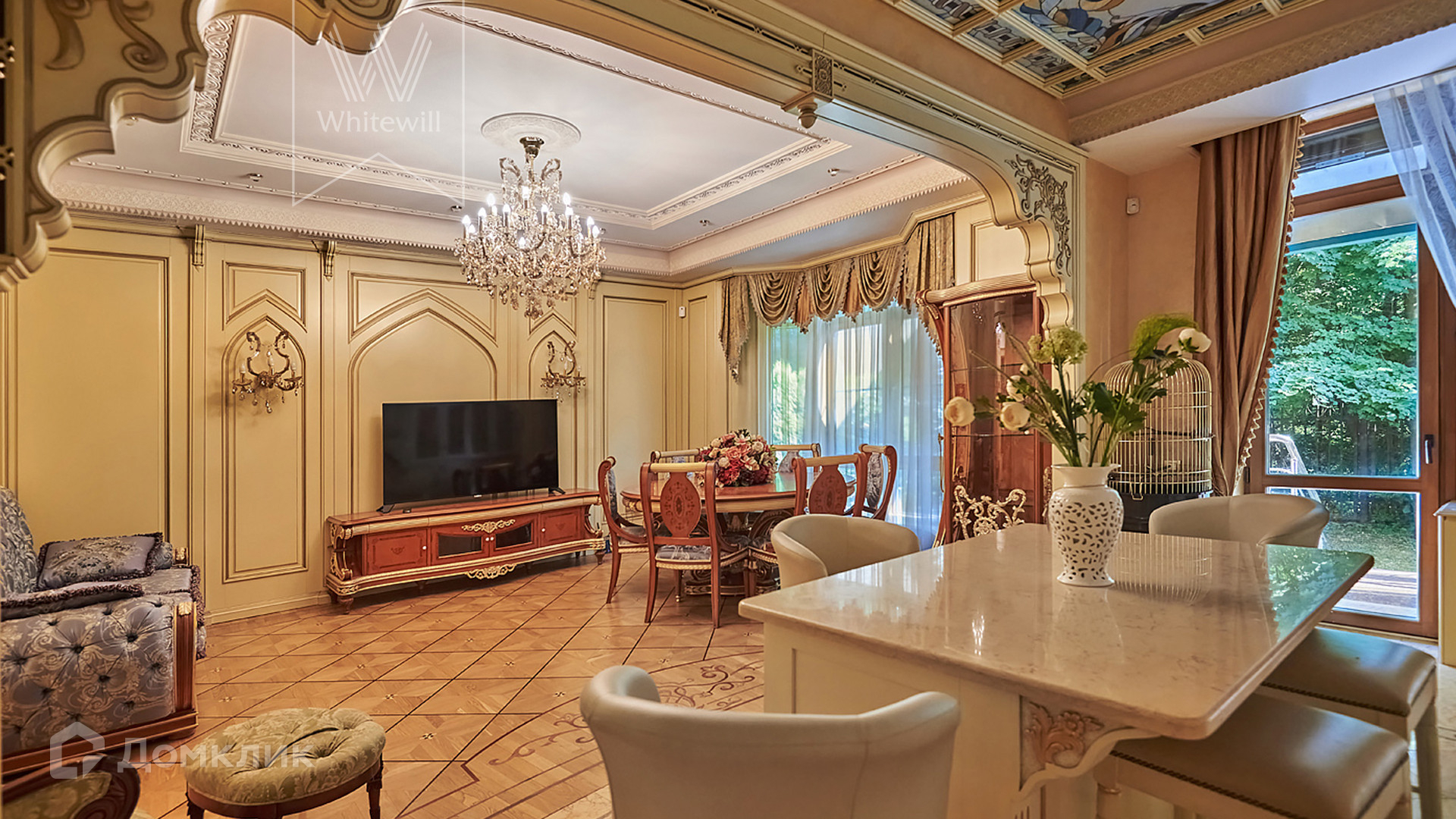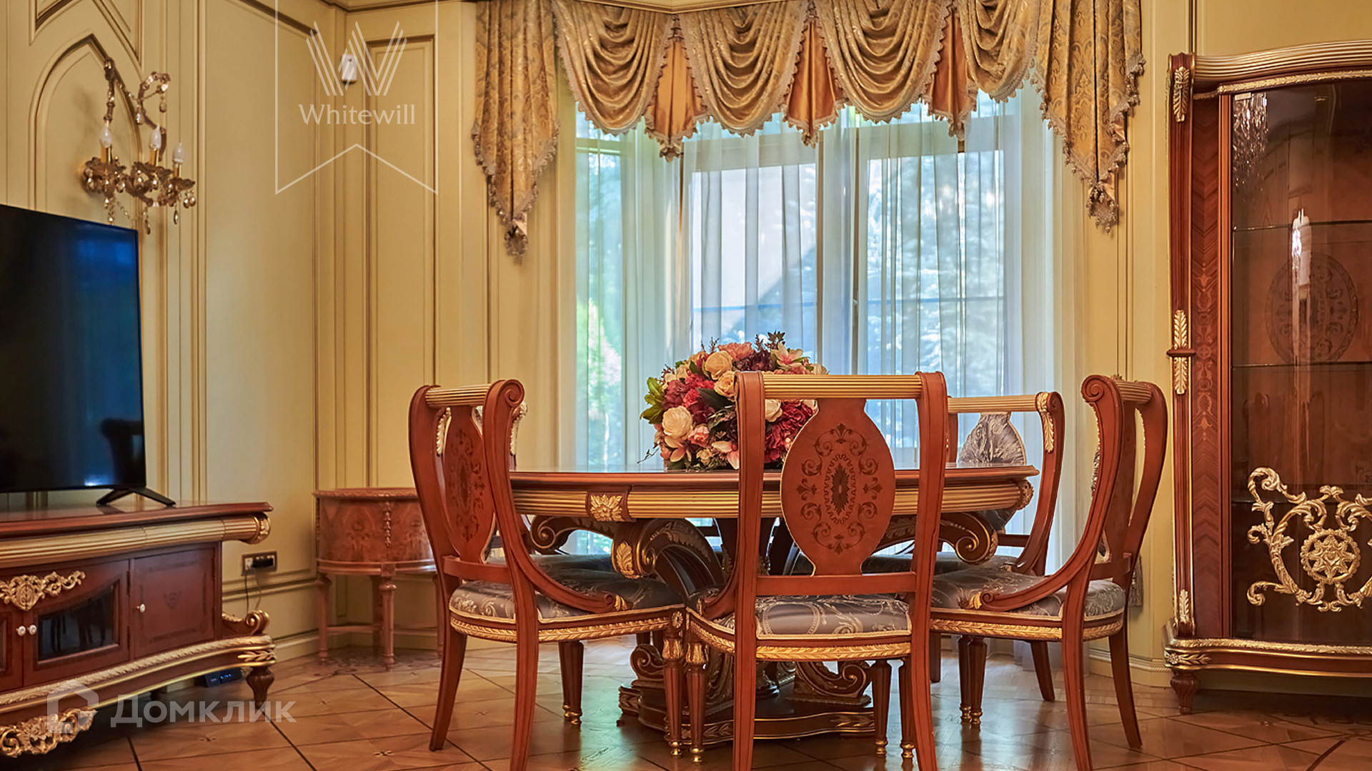 ID 854. С коллегами работаем 50/50. Трёхэтажный таунхаус площадью 323 м² в комплексе премиум-класса «Золотые Ключи-2» рядом с природным парком реки Раменки. Таунхаус включает три этажа, мансарду и подземный этаж. Выполнена премиальная отделка в стиле дворцовой классики. В отделке использованы ценные породы дерева, интерьер украшен лепниной и витражами.