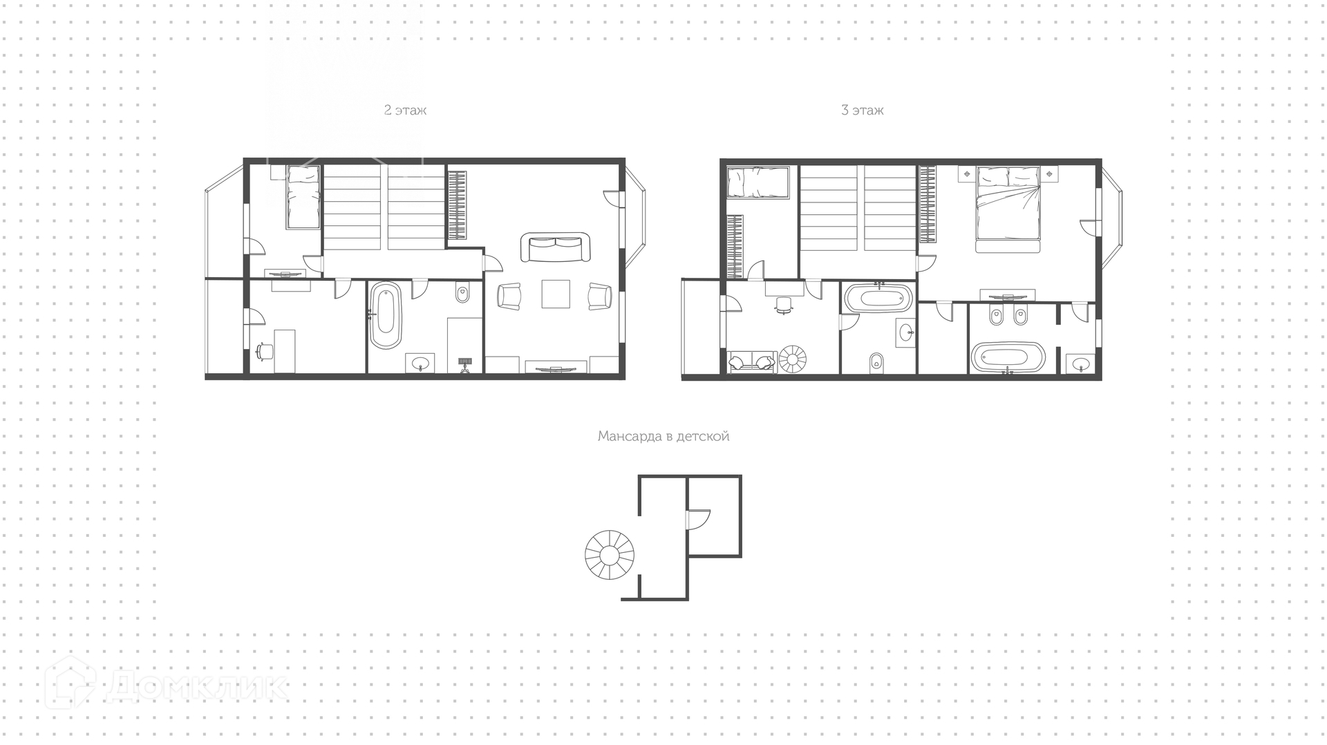 3-й этаж: мастер-спальня с лоджией с видом во двор, санузел, гардероб, двухуровневая детская с мансардой, лоджией и санузлом. На мансарде спланирована гардеробная.