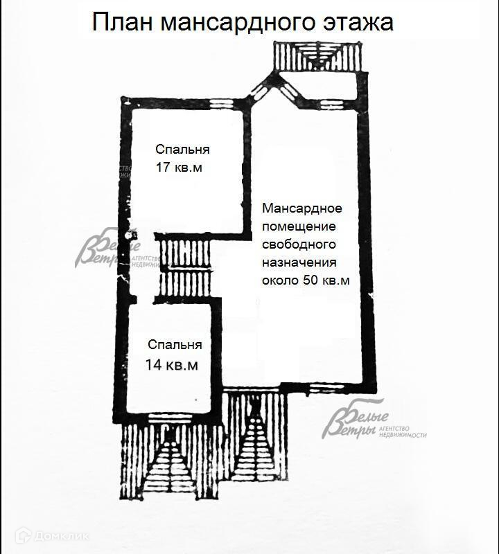 3-ий этаж: спальня 17 кв.м, мансардное помещение свободного назначения около 50 кв.м, спальня 14 кв.м.