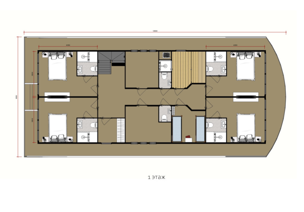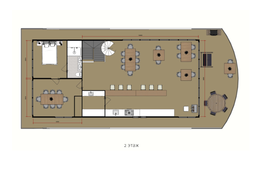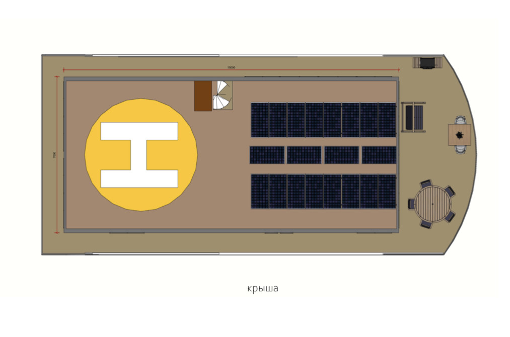 Общая площадь тёплых помещений 212 м², четыре номера с индивидуальными с/у по 14,6 м², номер категории «Люкс» 29 м², каюта капитана/персонала 6,5 м², сауна 6 м², два общих с/у по 1 м², коридоры 24 м², ресторан-бар 70 м². На крыше оборудована вертолётная площадка.