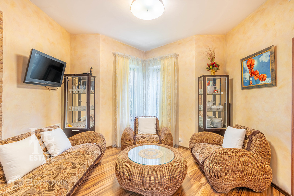 Первый этаж: кухня, столовая со своим выходом на улицу, гостиная, гостевая спальная со своей гостиной, санузел.