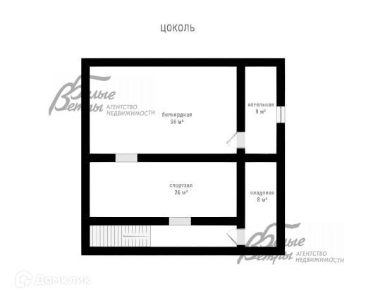 Цокольный этаж: бильярдная 36,5 кв.м, спортзал 26 кв.м, котельная 8,7 кв.м, кладовая 8,6 кв.м..