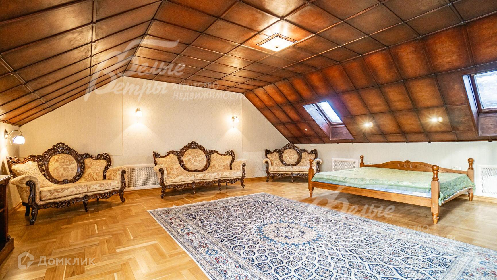 Мебель, оборудование: кухонный гарнитур производства Италия из массива дерева (орех) с обеденной группой. Диванные группы в гостиных, на мансардном этаже резная диванная группа. Кровати в спальнях (в мастер-спальне шириной 2 м). Дорогая мебель в санузлах (тумбы под раковинами, шкафчики и т.п.)..