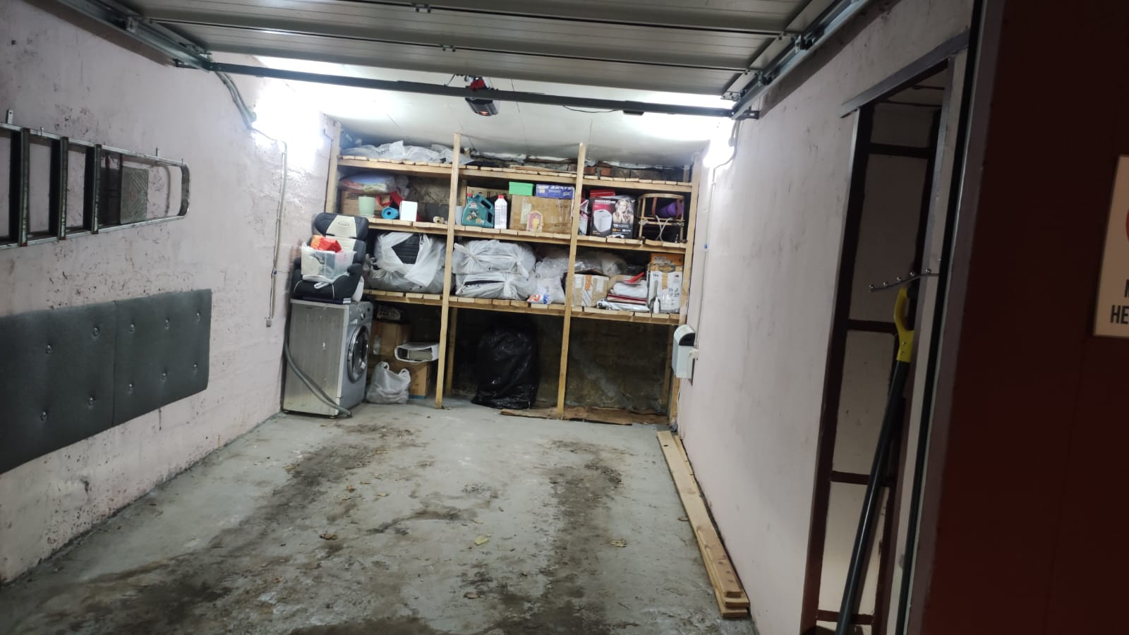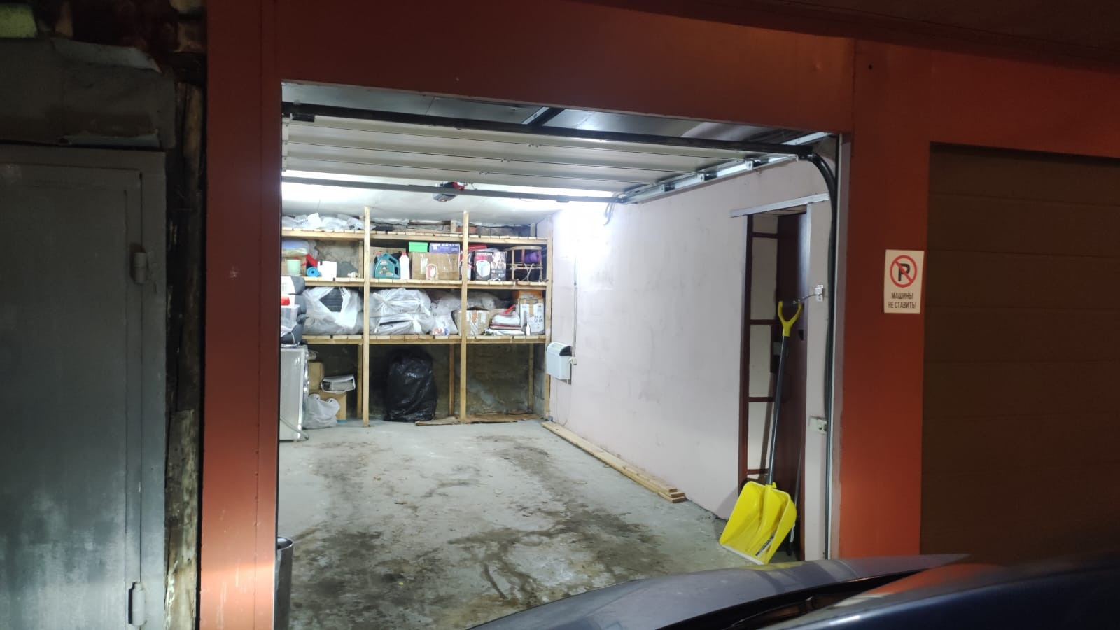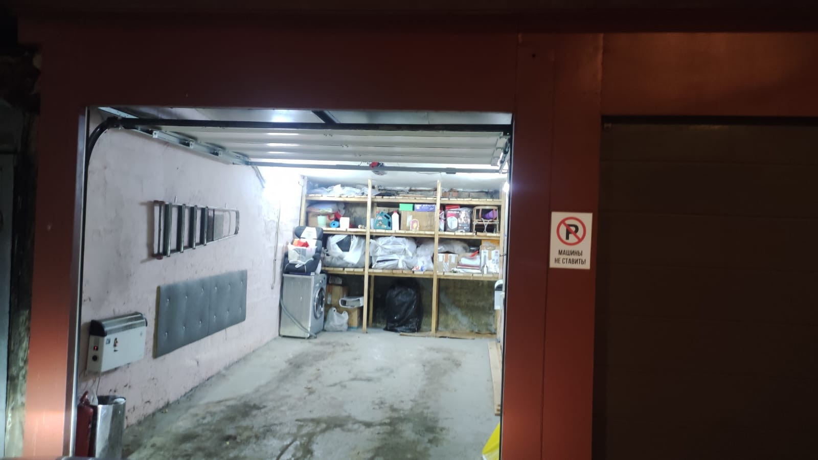 В гараже установлены автоматические роллеты, электрические радиатора и стеллажи.