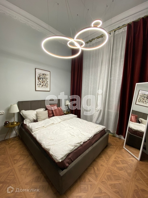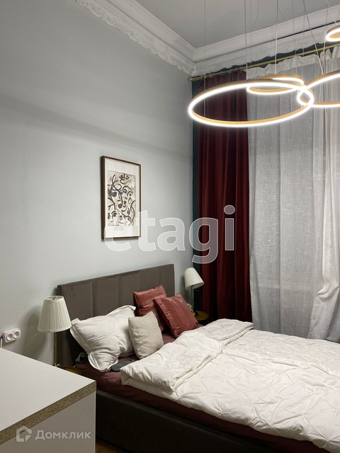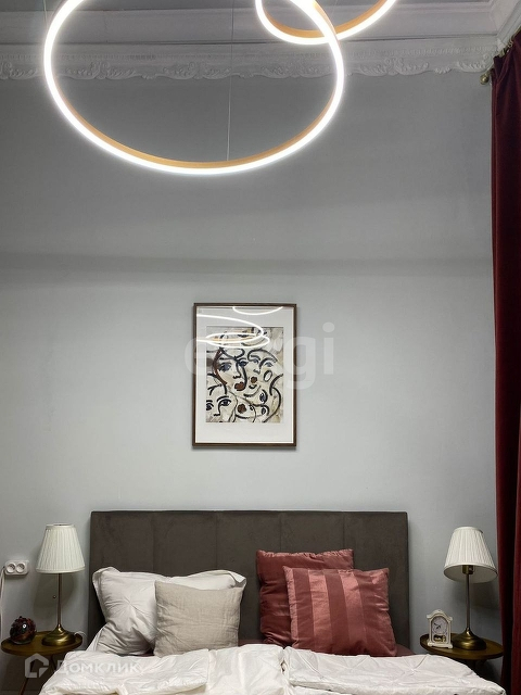 Над кроватью расположена красивая кольцевая люстра, управляется с пульта (можно менять цвет и яркость освещения), дополнительное освещение обеспечено за счёт светодиодной ленты.