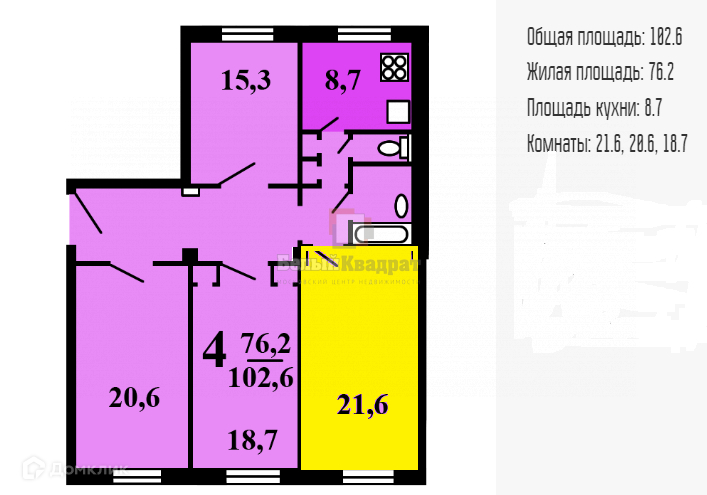 Жилая площадь 21.6 м2