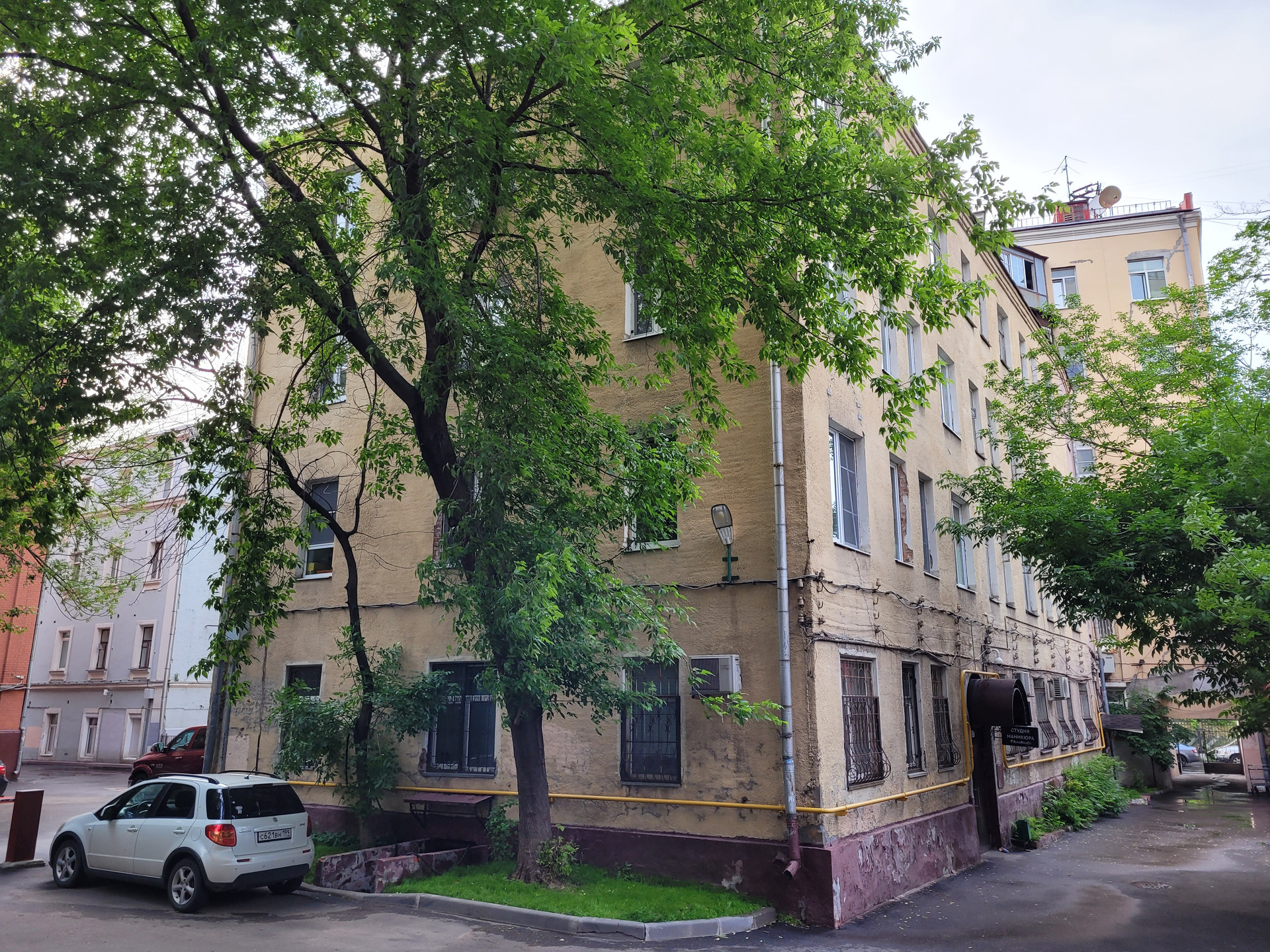 Двор небольшой, парковочных мест немного, нужно оформлять резидентное разрешение на парковку, в этом случае, машину можно будет круглосуточно оставлять в переулке.