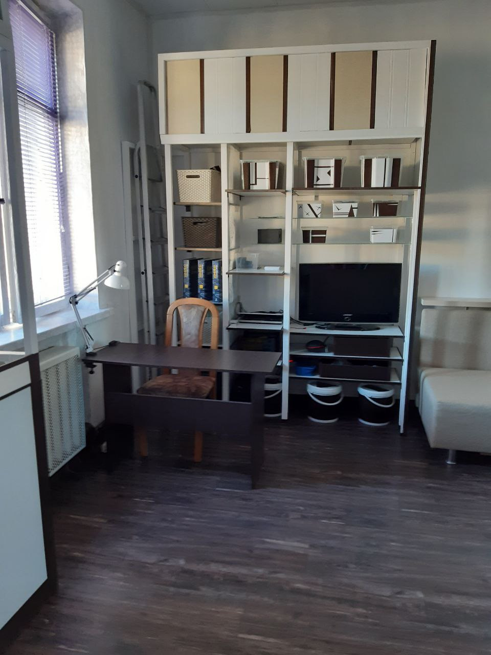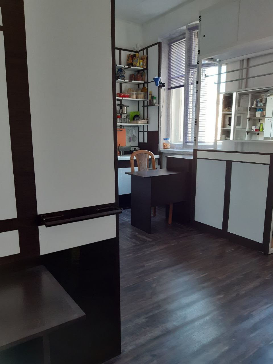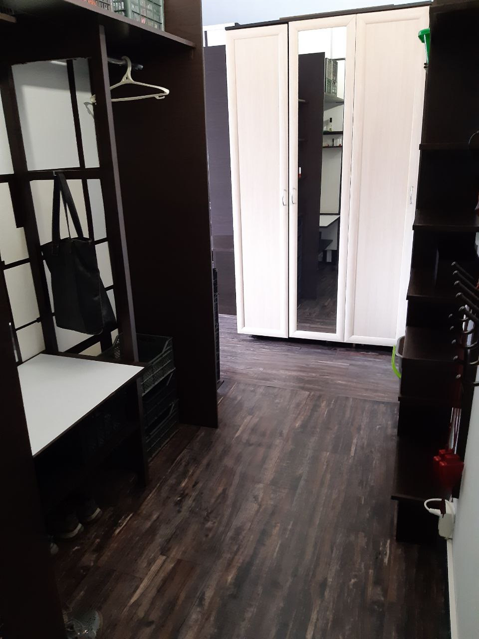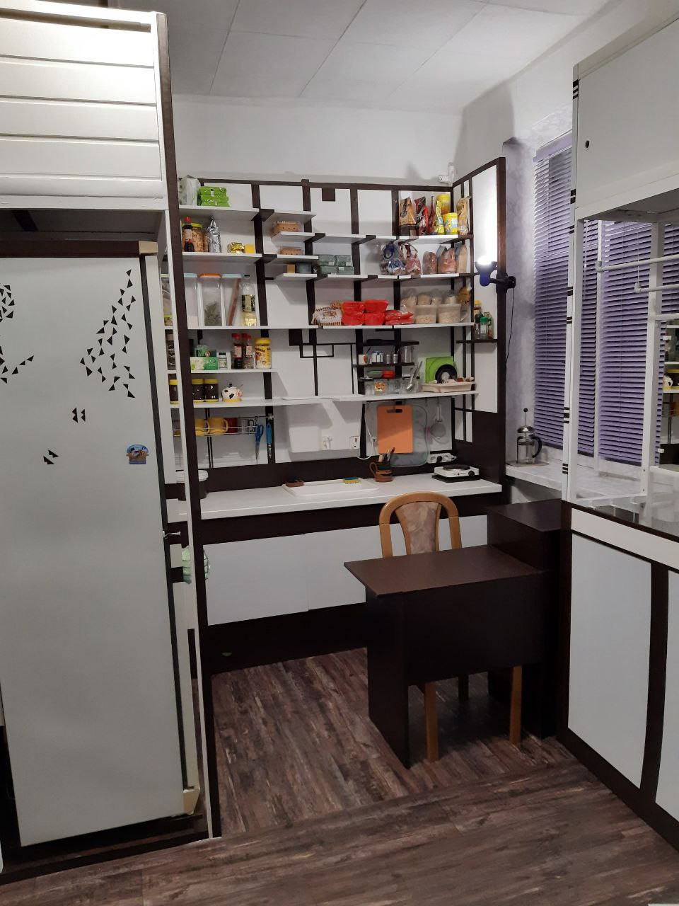 Остаётся: холодильник, стиральная машинка, диван, все шкафы и полки, так как делались по месту.