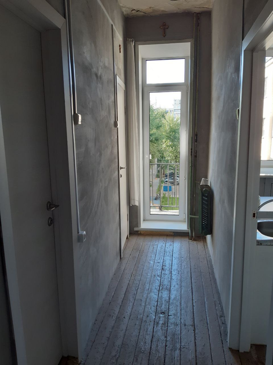В комнате 2 окна - можно зонировать. Кому надо - делят  её  перегородкой, получая в каждом отсеке своё окно. Окна во двор.  В квартире есть общий балкон, который тоже выходит во двор. Во дворе детская площадка.