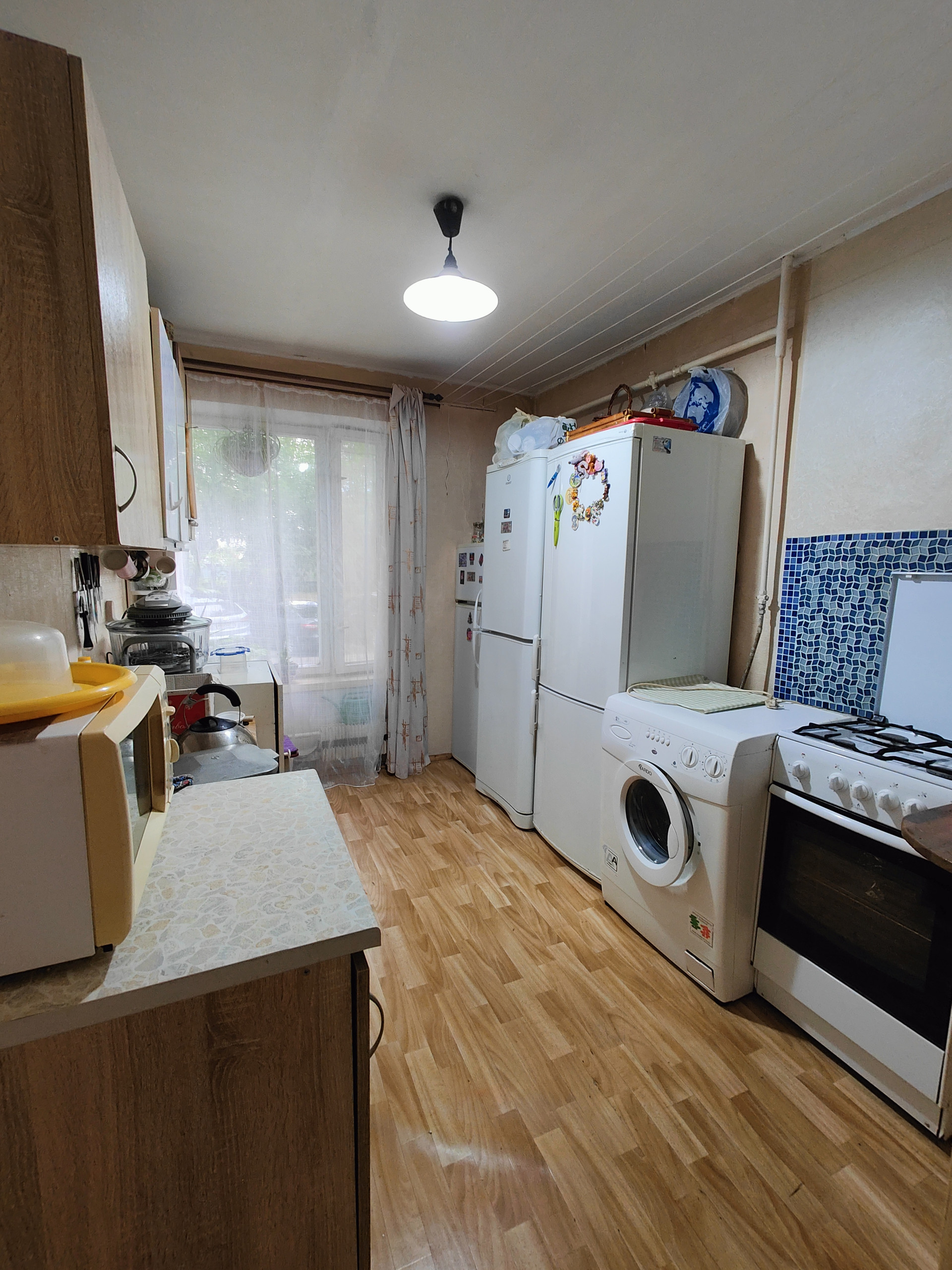 Комната меблирована, на кухне установлен холодильник, стиральная машина и необходимая  мебель.