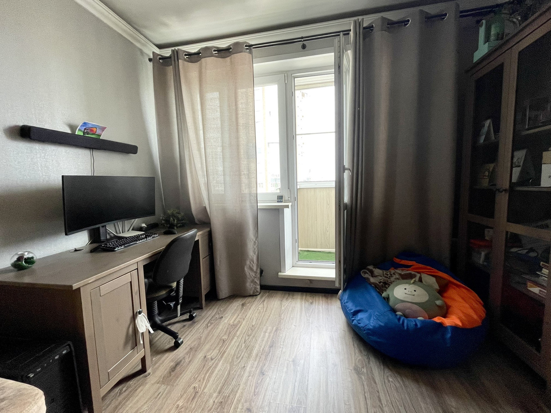 Комната светлая, окна на солнечную сторону (панорамный вид на Парк Победы, праздничный салют виден с балкона), евроремонт в нейтральных тонах (делали для себя, продумана каждая мелочь: освещение, подсветка, пластиковые окна, ламинат). Большая общая территория: просторная кухня, раздельный санузел, полноценная ванная, антресоль, встроенный шкаф-купе для вещей и размещения стиральной машины.