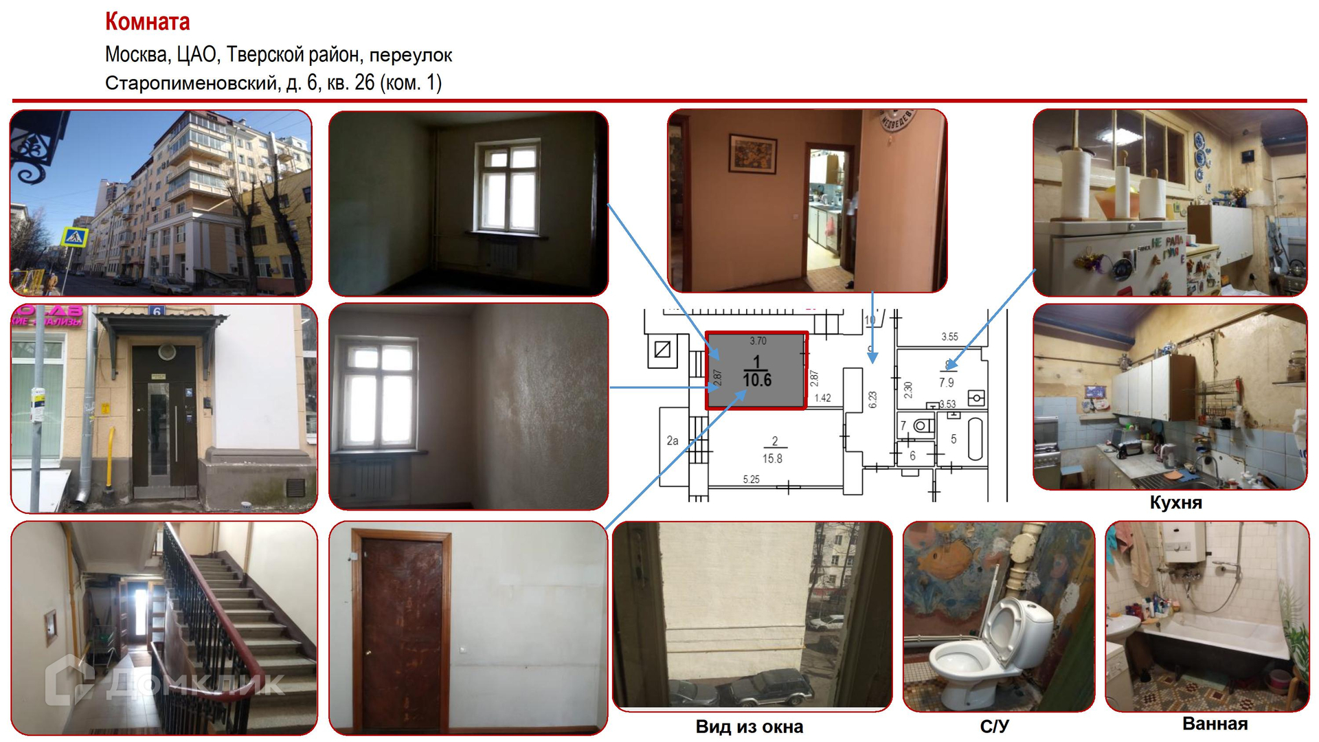 Комната, 10.6 м2, на продажу в Москве, Старопименовский переулок, 6