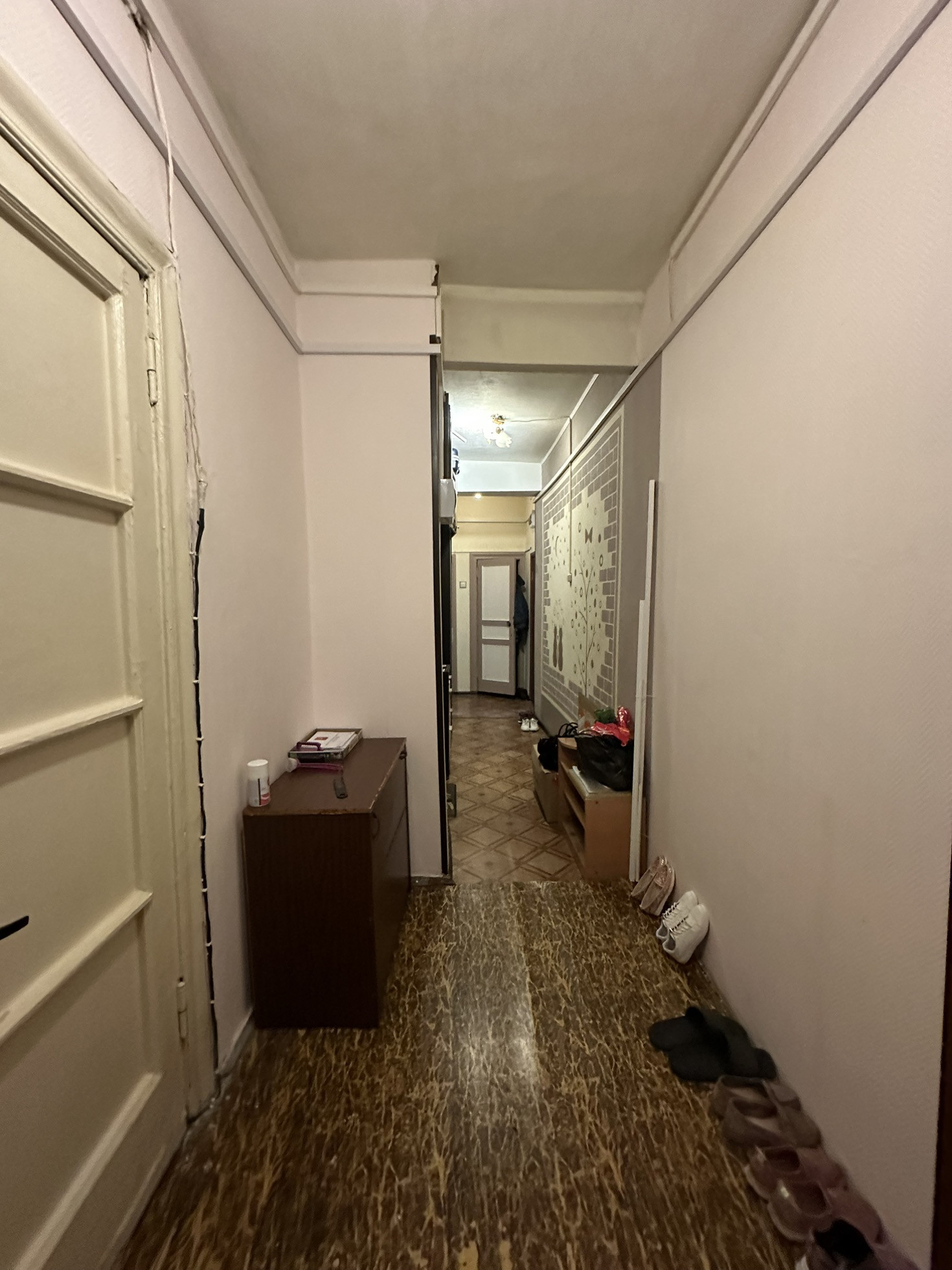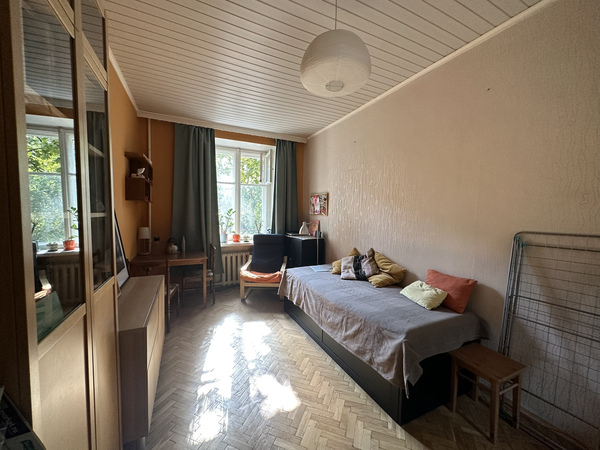 Большая комната в 3-комнатной  коммунальной квартире, в кричном доме. Свой отдельный кадастровый номер. Состояние хорошее,   ремонт свежий, в комнате восстановлен паркет. Окна выходят на зелёную улицу. Счета за электричество разделены с соседями, отдельный счетчик. Есть кладовая. Дом кирпичный, высота потолков 2.8 м.