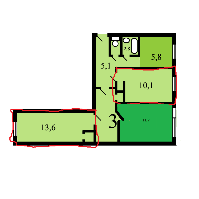 2 cобcтвенника , у первого 1 комната 11,7 кв.м в собственности (ждет реновацию),остальные 2 комнаты и жилая площадь у 2-ого собственника, которые продаются.