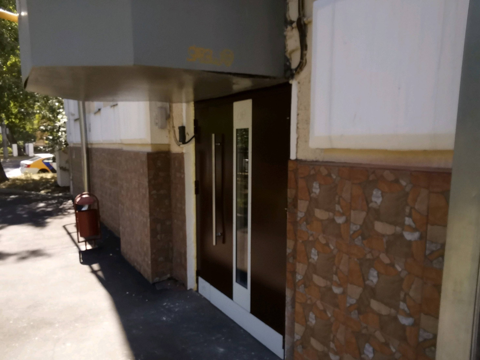 Ухоженный подъезд, лифт, придомовая территория за шлагбаумом.