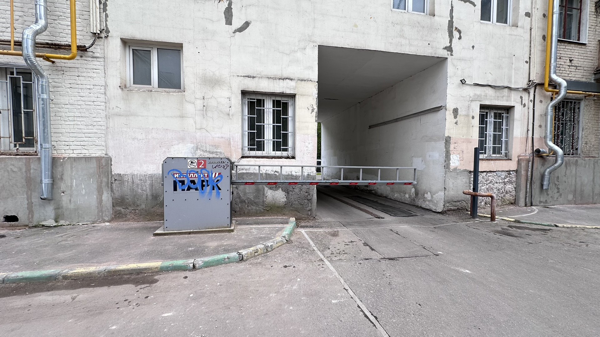 Закрытый двор, въезд через шлагбаум.
