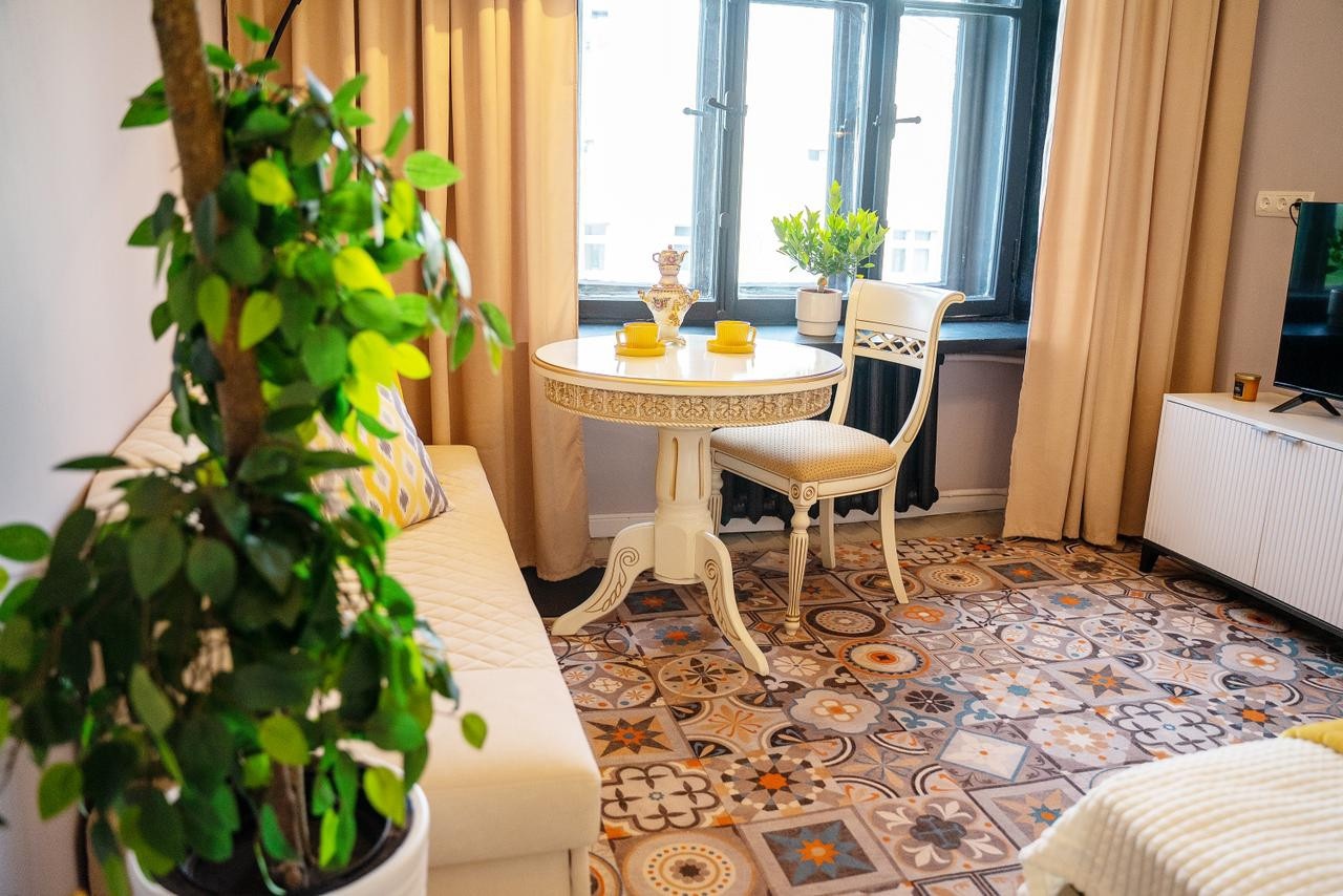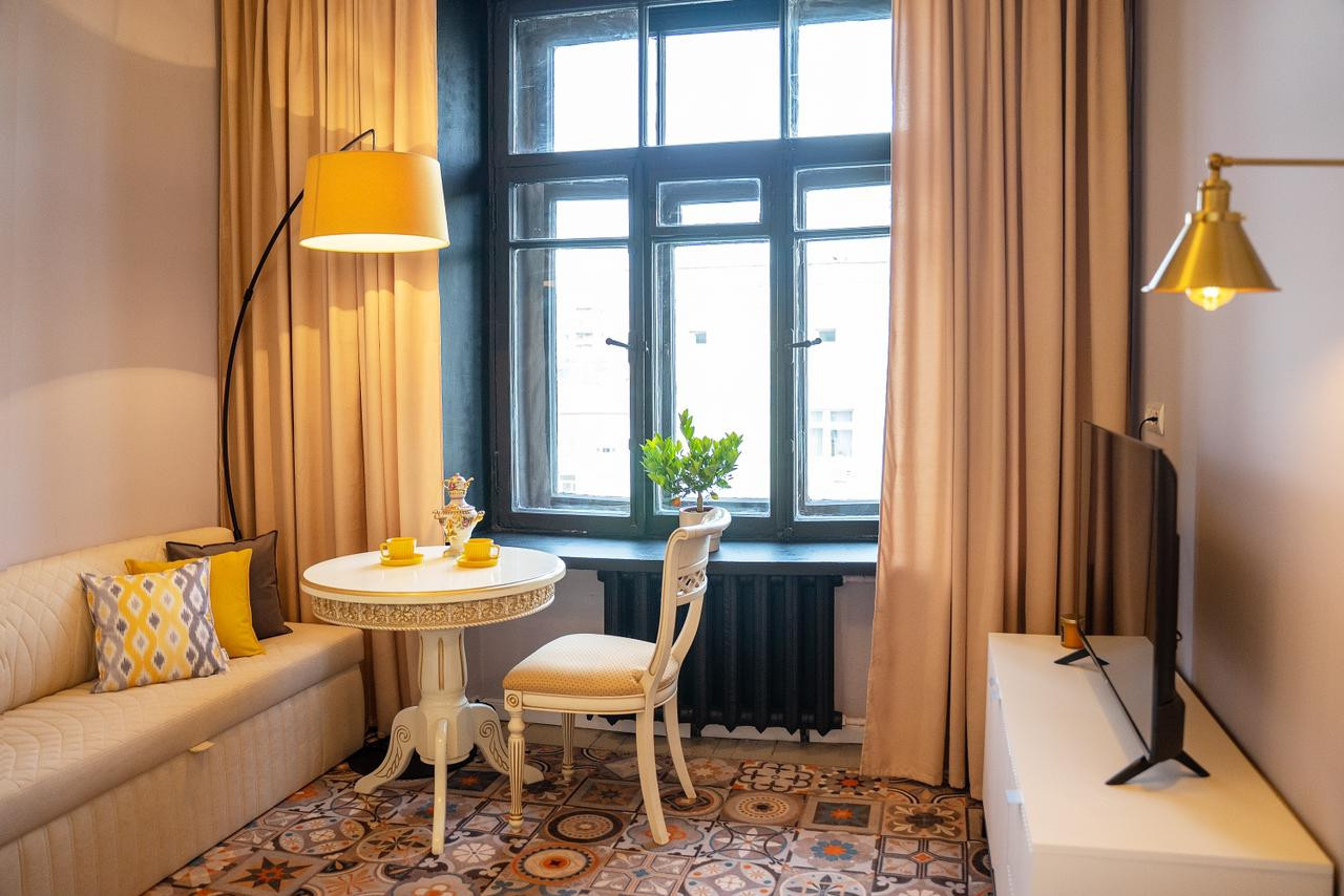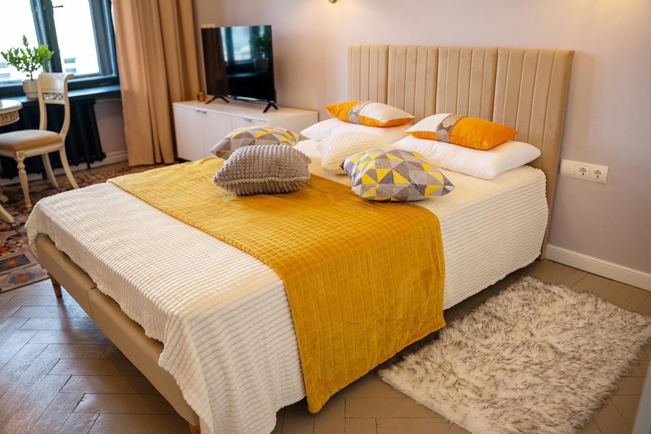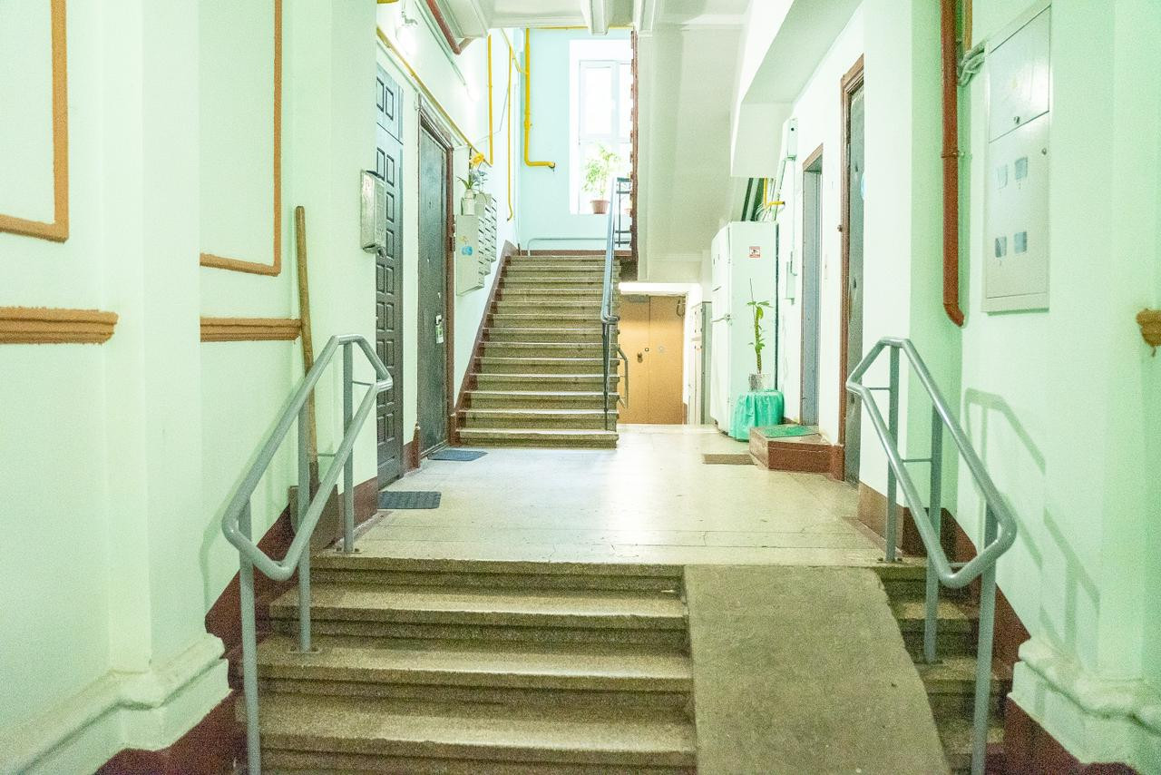 Потолки 330 см. Общая площадь квартиры 100 м2. Толстые кирпичные стены. Лифт. Парковка во дворе под шлагбаумом, всегда есть свободные места.