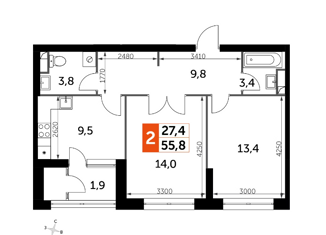 Общая площадь: 55.8 м2