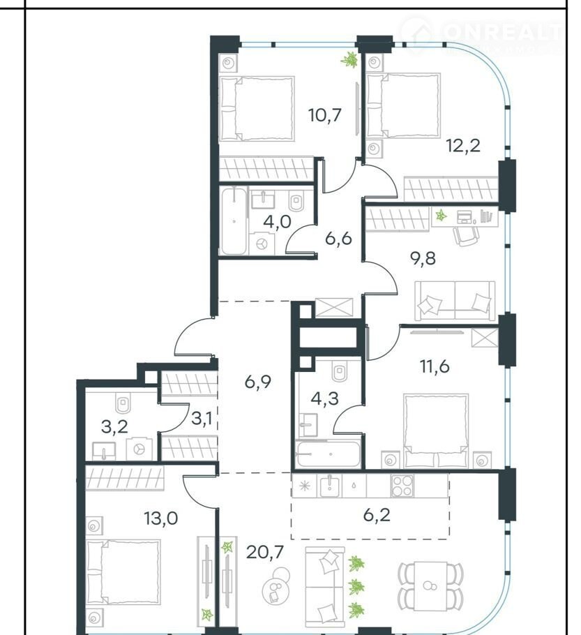 Квартира свободной планировки, благодаря высокими потолкам (3,20 м.) и панорамным окнам на три стороны квартира будет очень светлой.  Из кухни- гостиной вид на парк и Академию ФСБ, из спален на городской пейзаж.