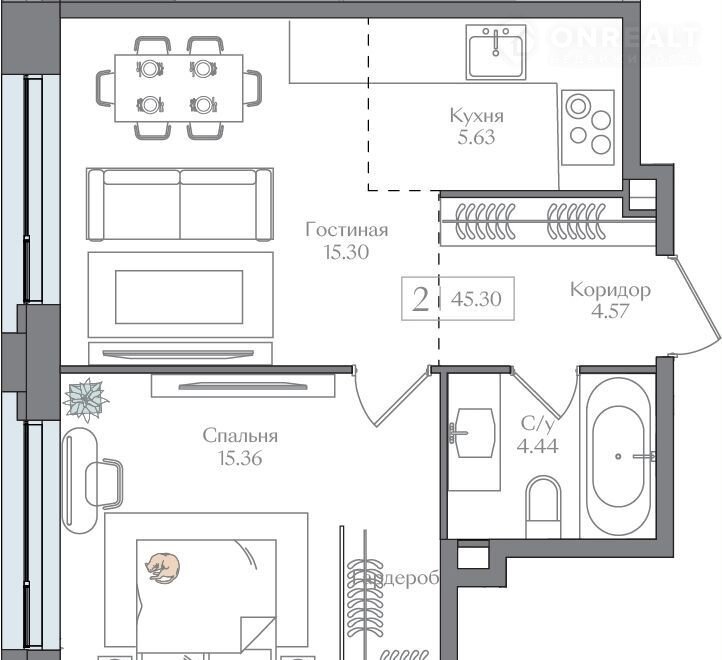 Общая площадь 45.3 м2