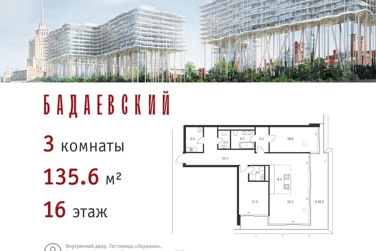 3-комнатная квартира, 135.6 м2, этаж 16 / 18, на продажу в Москве