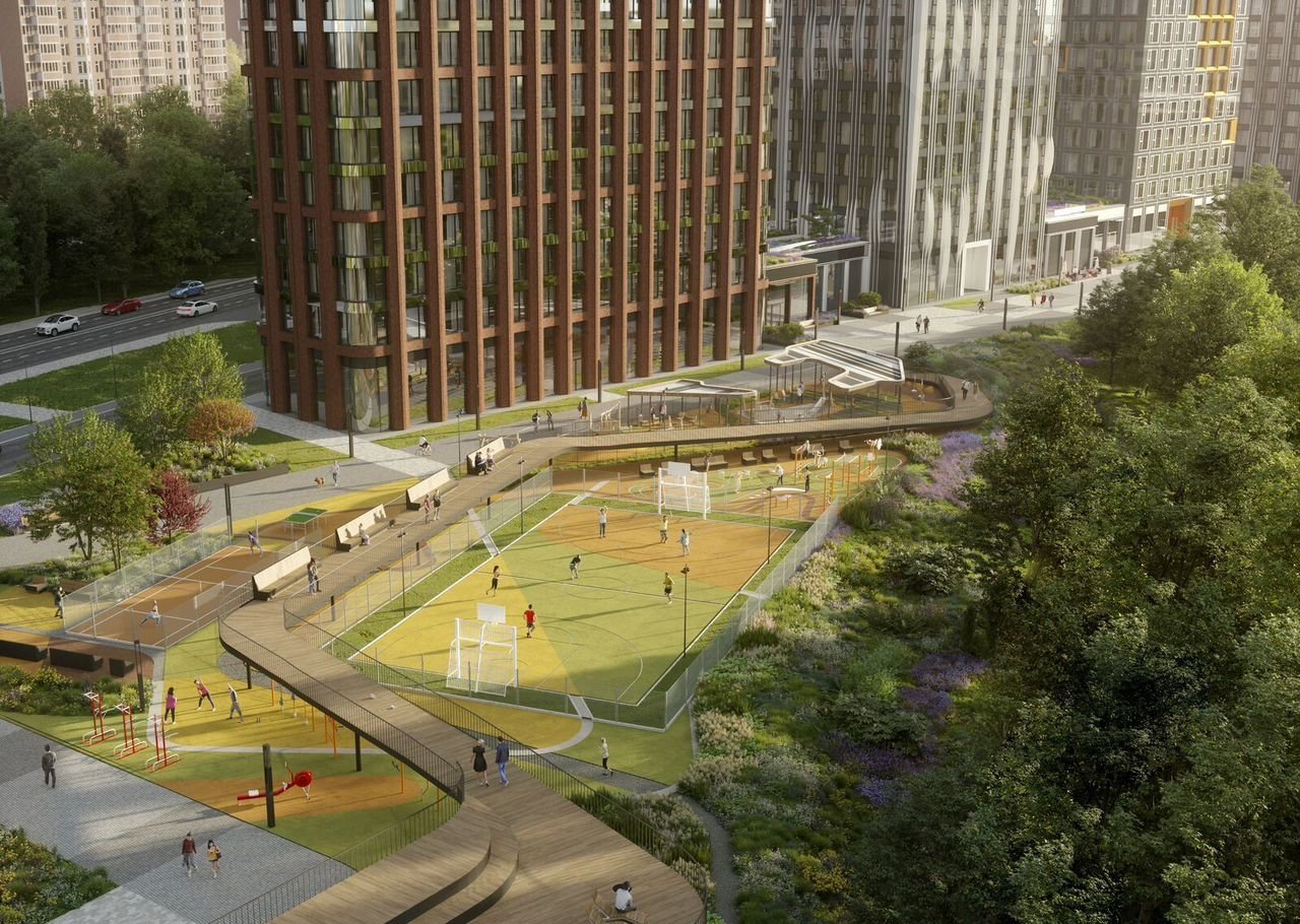 В концепции проекта Lеvеl Мичуринский воплощена идея общей территории площадью 4,5 га для всех корпусов. Главная достопримечательность — видовой мост протяжённостью 155 м, который одновременно является трибуной для болельщиков. Он будет начинаться на уровне земли и постепенно подниматься до тихого пространства для отдыха. Также мы предусмотерли вертикальную досуговою площадку протяжённостью 128 м, спортивные площадки, зоны для воркаута и работы на свежем воздухе, столы для пинг-понга, площадку для петанка и пляжного волейбола, футбольное поле, настольный теннис, террасы с видом на парк и уличный кинотеатр.