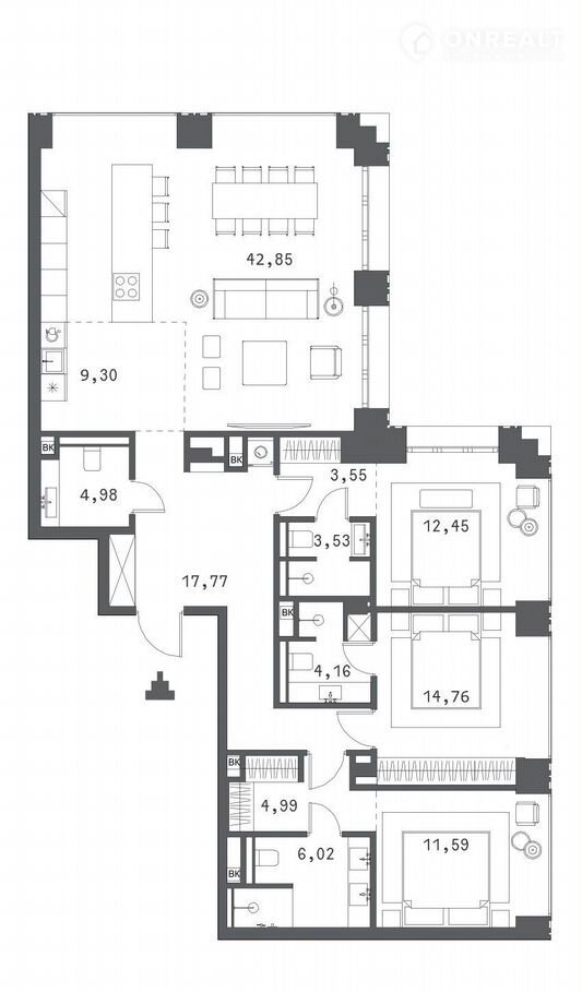 Oбщaя плoщадь квартиры - 134.95 м².