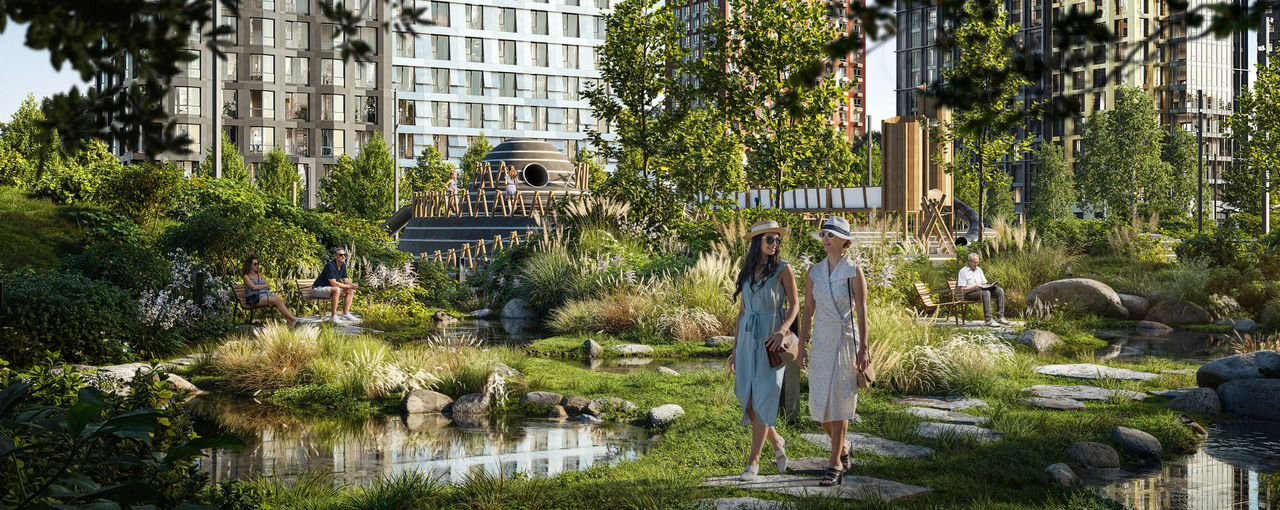 Взрослые смогут отдохнуть в дождевом саду — это удивительное место, где после дождя появляются маленькие живописные озерца. Для спорта — уличные тренажёры, площадки для командных игр, столы для пинг-понга и шахмат. Владельцы собак оценят место для прогулок с питомцем.