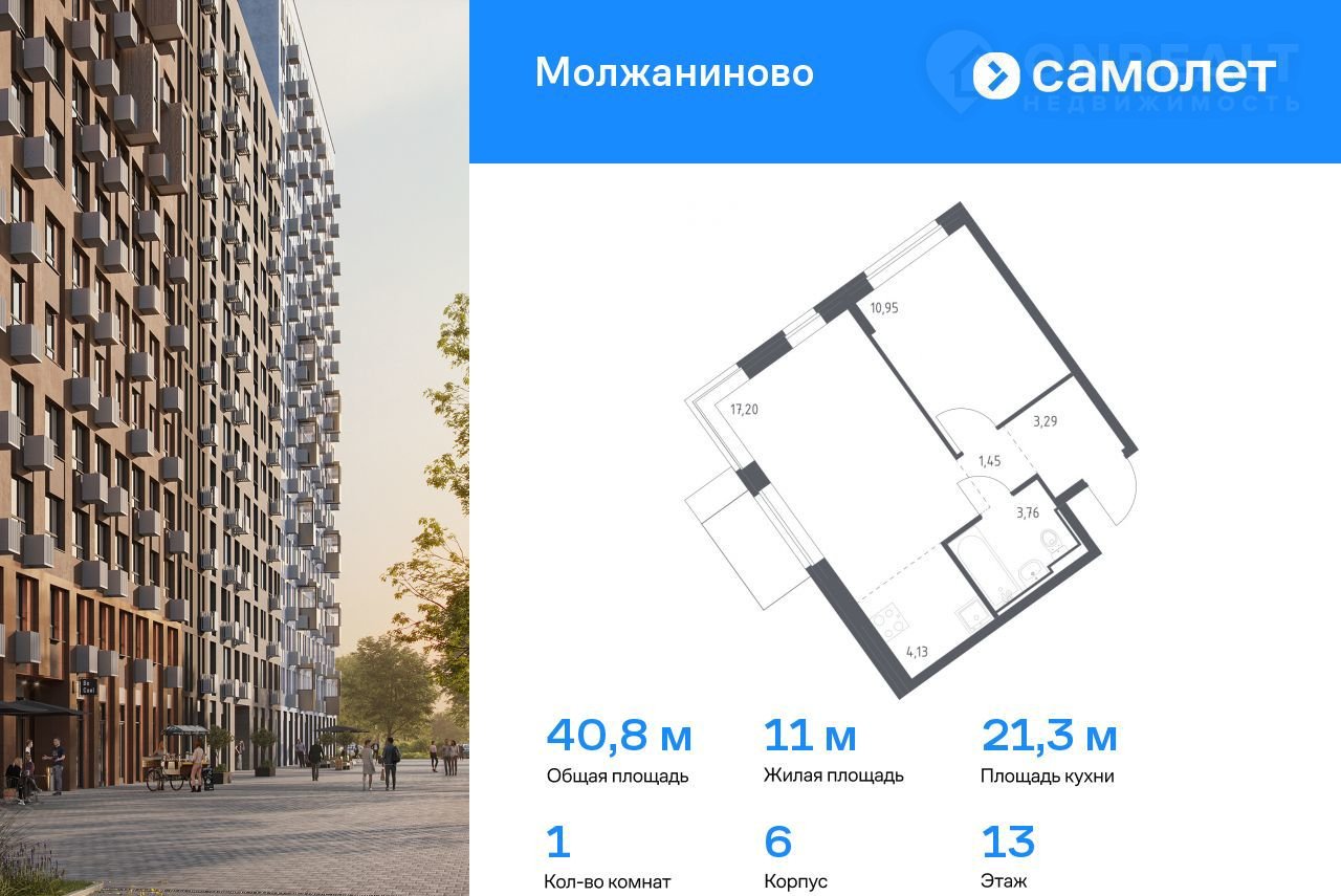 1-комнатная квартира, 40.8 м2, этаж 13 / 13, на продажу в Москве, жилой комплекс Молжаниново, к6