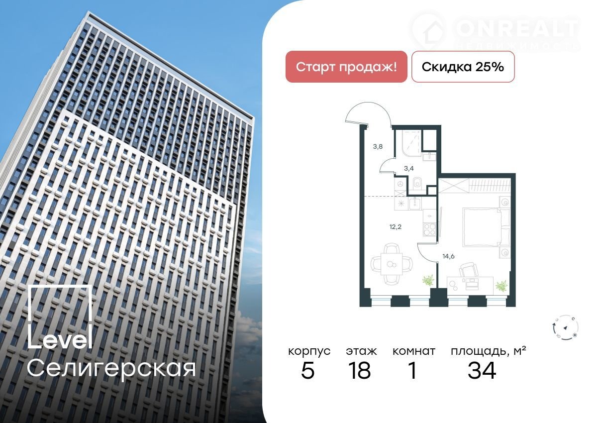 1-комнатная квартира, 34 м2, этаж 18 / 40, на продажу в Москве