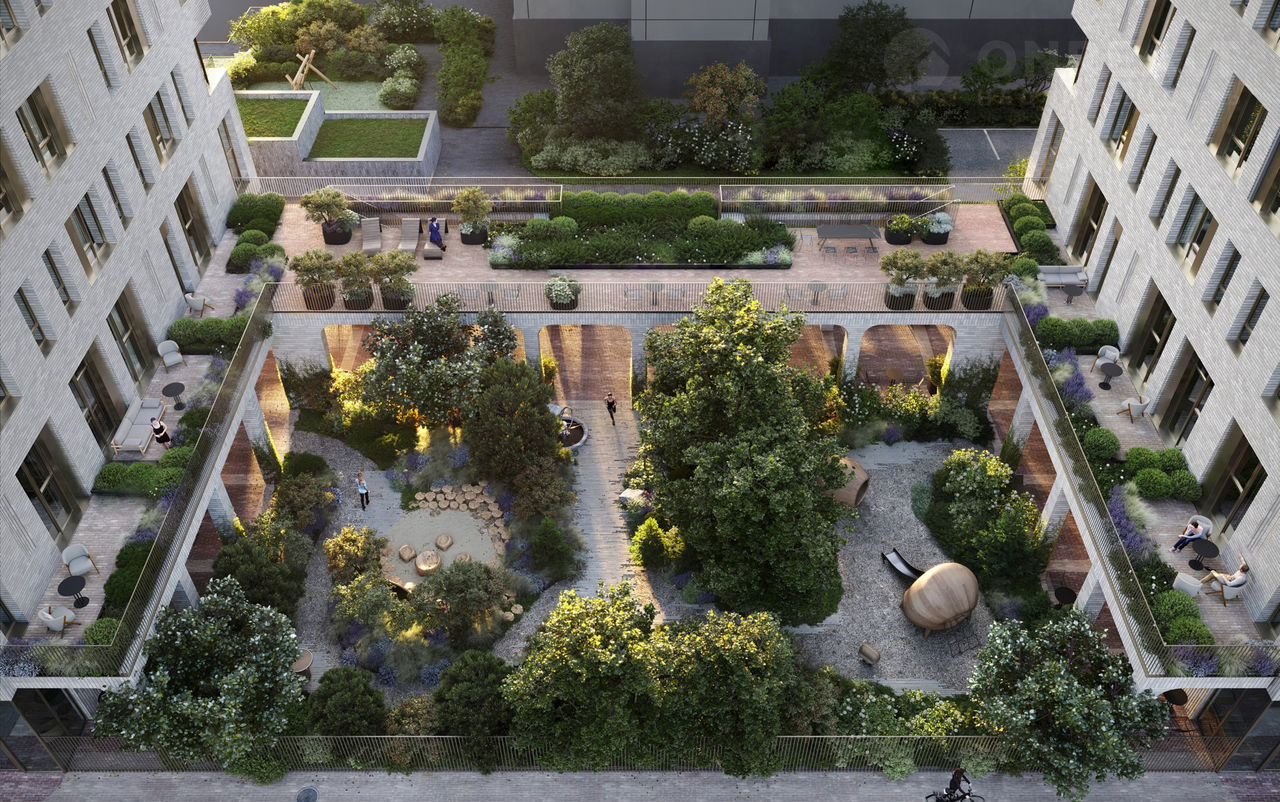 58 машиномест в подземном паркинге. Каждое — с зарядкой для электромобиля. Есть мотоместа. Предусмотрено хранение велосипедов и самокатов, колясочные и лапомойки. В приватном атриумном дворе сад с дорожками из натурального камня, воркаут-зона, места для отдыха и работы. Отдельная парковка для курьеров. Для курьеров будет отдельный вход, чтобы не пересекаться с остальными жильцами.
