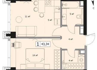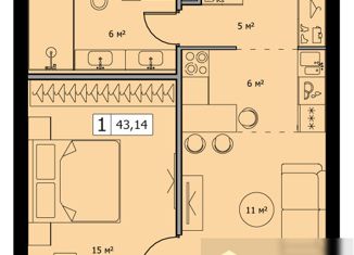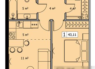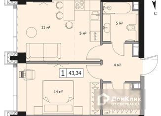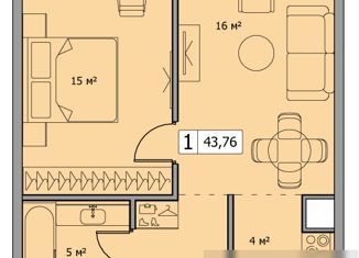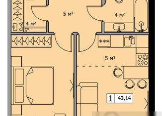 Однокомнатная квартира на продажу, 43.7 м2