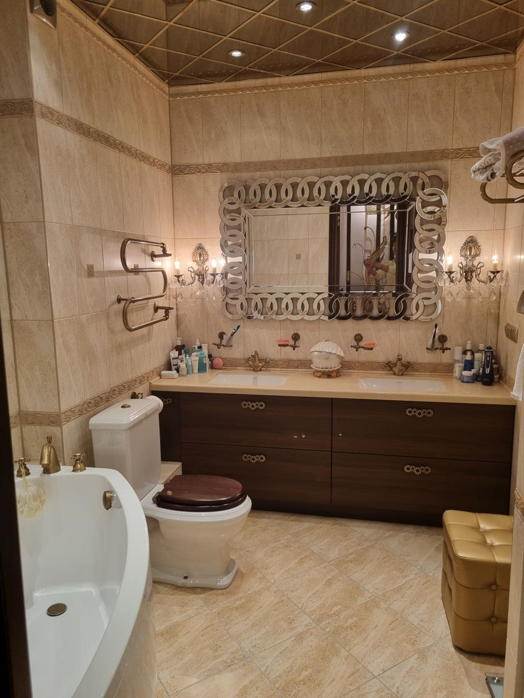 В квартире 2 санузла, есть подогрев пола (кухня, прихожая, большой с/у), 2 кондиционера Mitsubishi, сантехника Duravit и Villeroy&boch, итальянские краны, 2 полотенцесушителя Margaroli, стиральная машина smeg, сушильная машина smeg, бытовая техника smeg (варочная панель, духовой шкаф), посудомойка bosch. Витражные двери (массив дуба, алюминиевый профиль), витражный потолок на кухне, межкомнатные двери массив дуба, полы массив дуба, плитка versace collection.