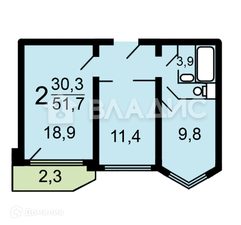 Общая площадь 51.7 м2