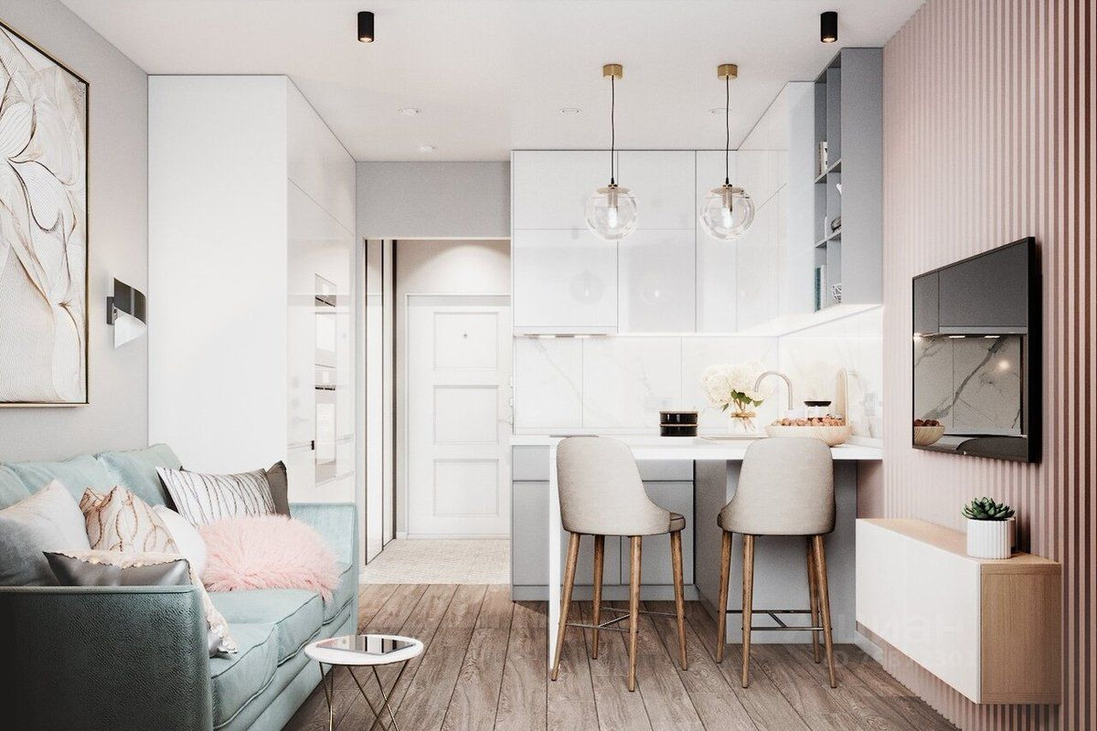 Студия с черновым ремонтом. На фото пример дизайна.
