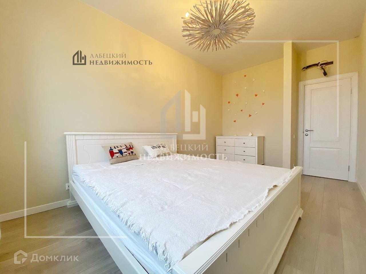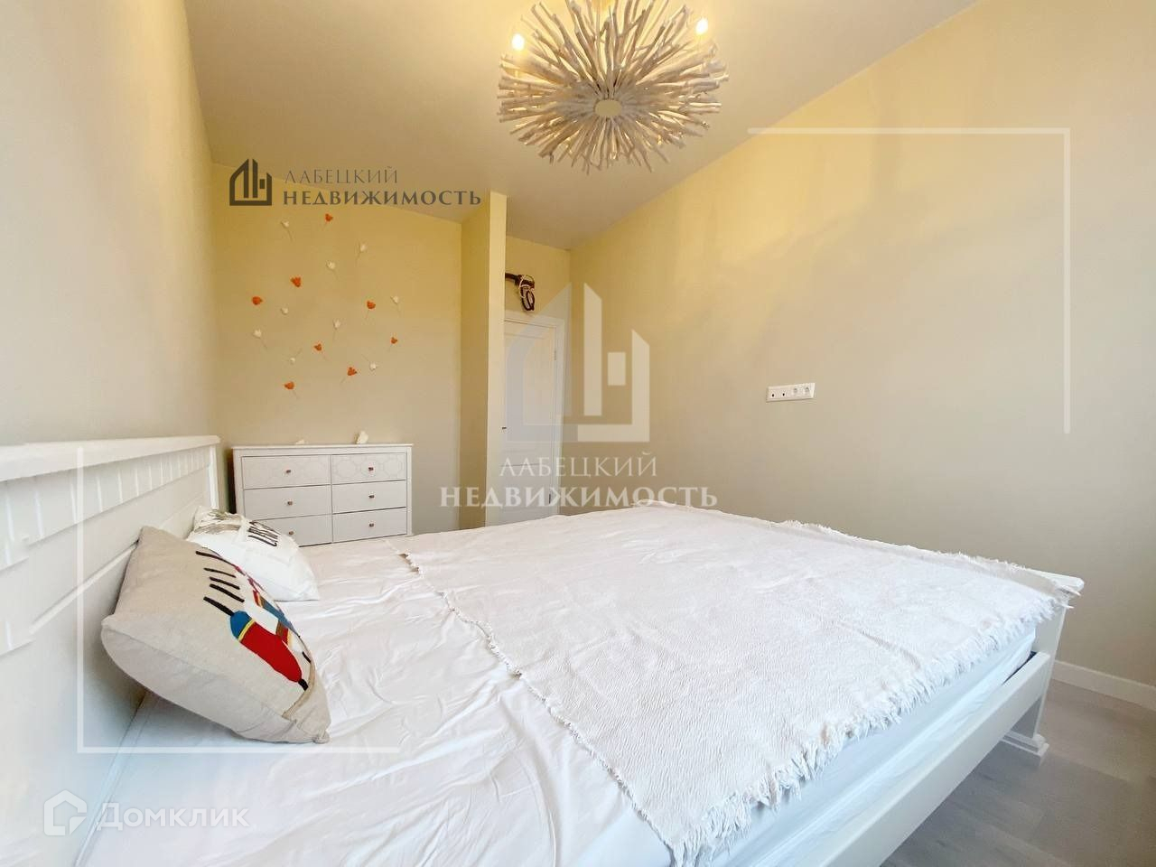 Спальная комната оснащена двуспальной кроватью, дизайнерской люстрой, а также нишей под дополнительное место хранения.
