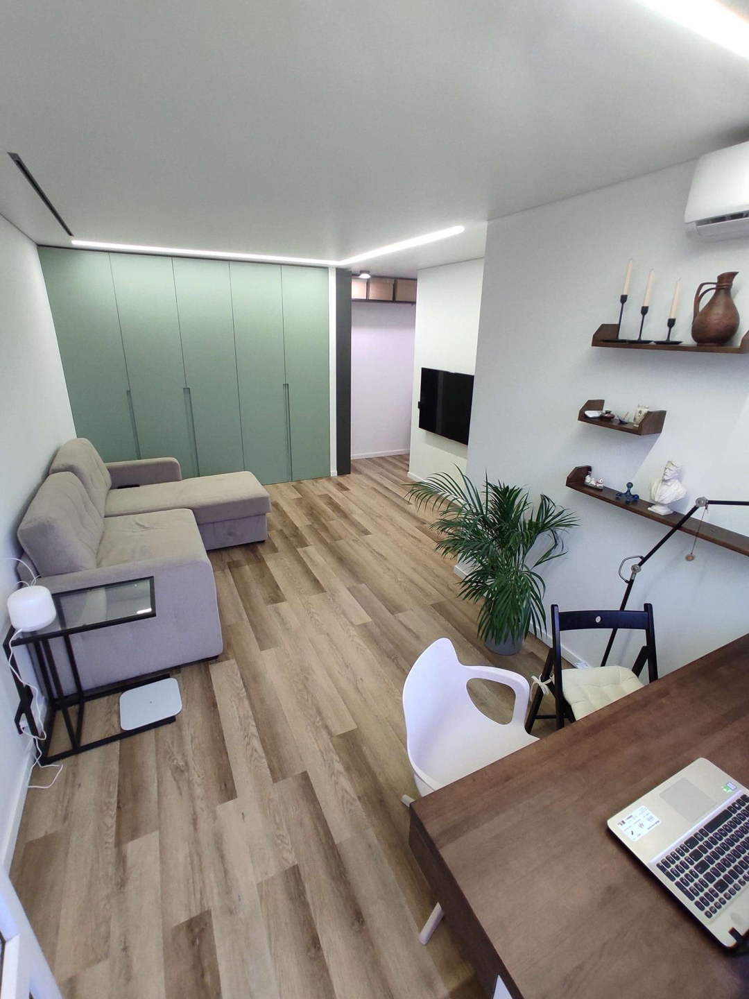 В этом году сделан капитальный дизайнерский ремонт, с заменой полов, проводки, водоснабжения. Современный теневой потолок со светодиодными линиями и встраиваемыми светильниками, двери скрытого монтажа. В квартире есть зоны для приятного отдыха и предусмотрено  уютное рабочее место. Установлен кондиционер, бризер - очиститель воздуха. Современная