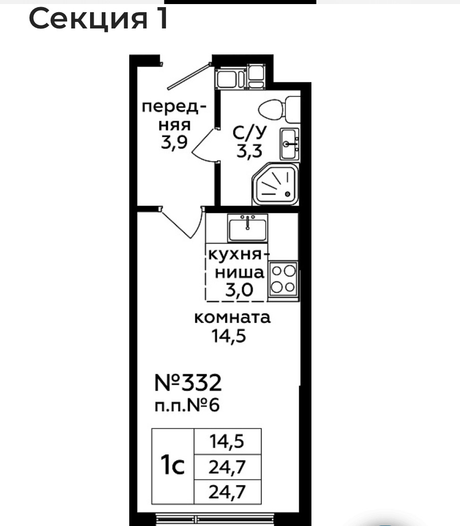 1-комнатная квартира, 25 м2, этаж 3 / 22, на продажу в Москве, 1-я Магистральная улица, 25
