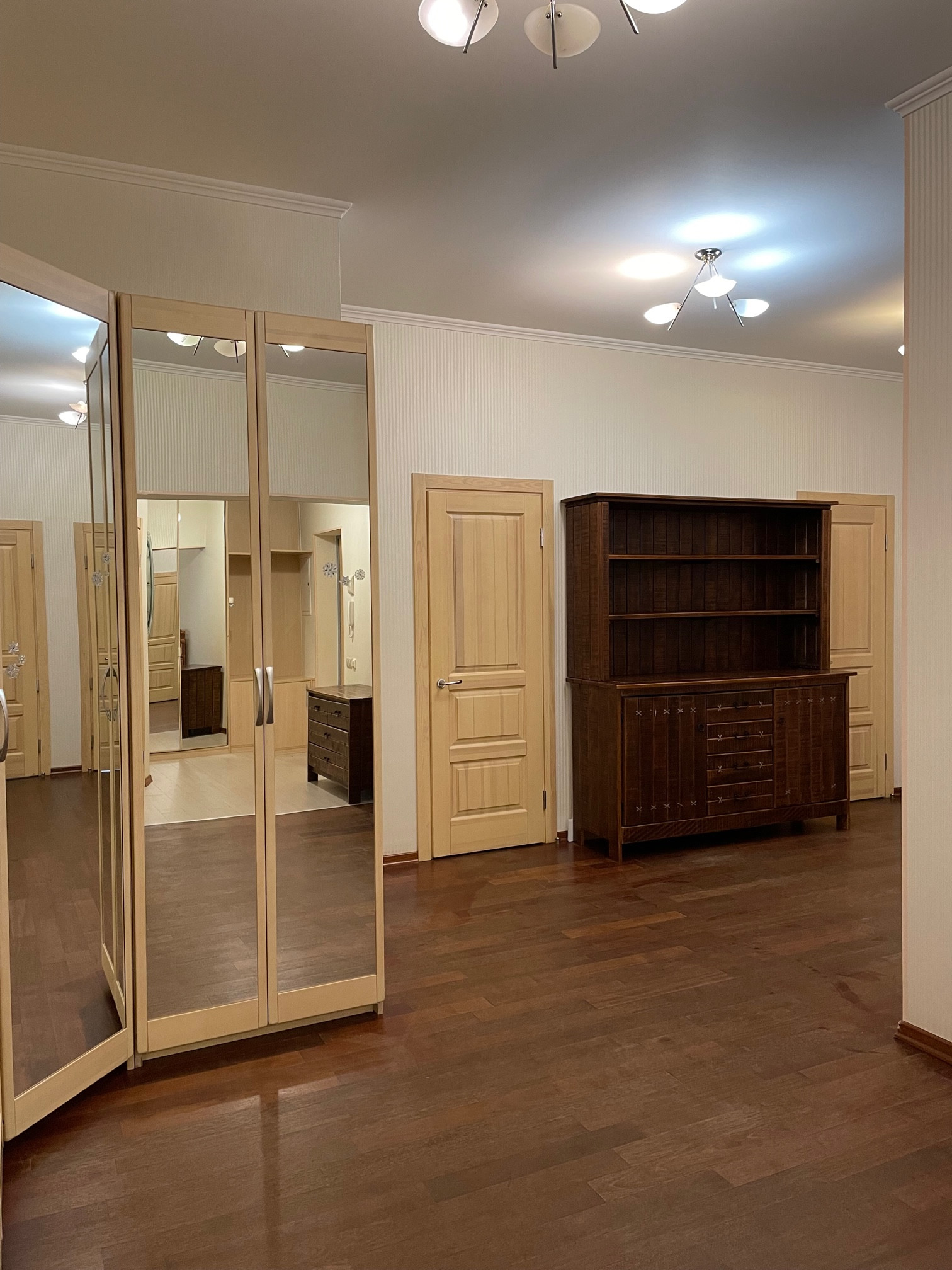 Просторная гостиная, кухня с лоджией, 3 спальни, 2 санузла, две вместительные гардеробные с продуманной системой хранения вещей. Двери, встроенные шкафы в гостиной и в холле - массив дуба. Во всей жилой зоне наборный паркет, в санузлах полы с подогревом.