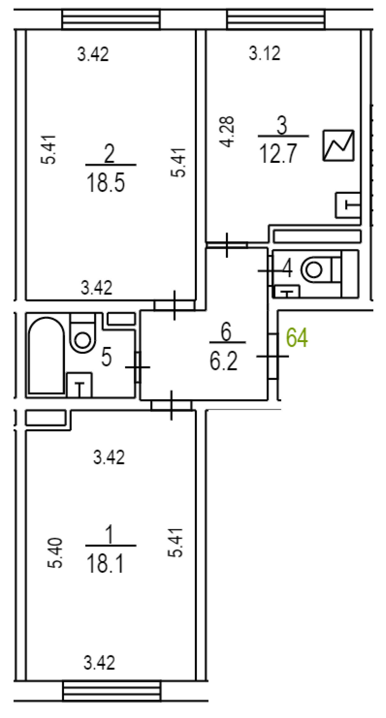 Общая площадь 60.5 м2