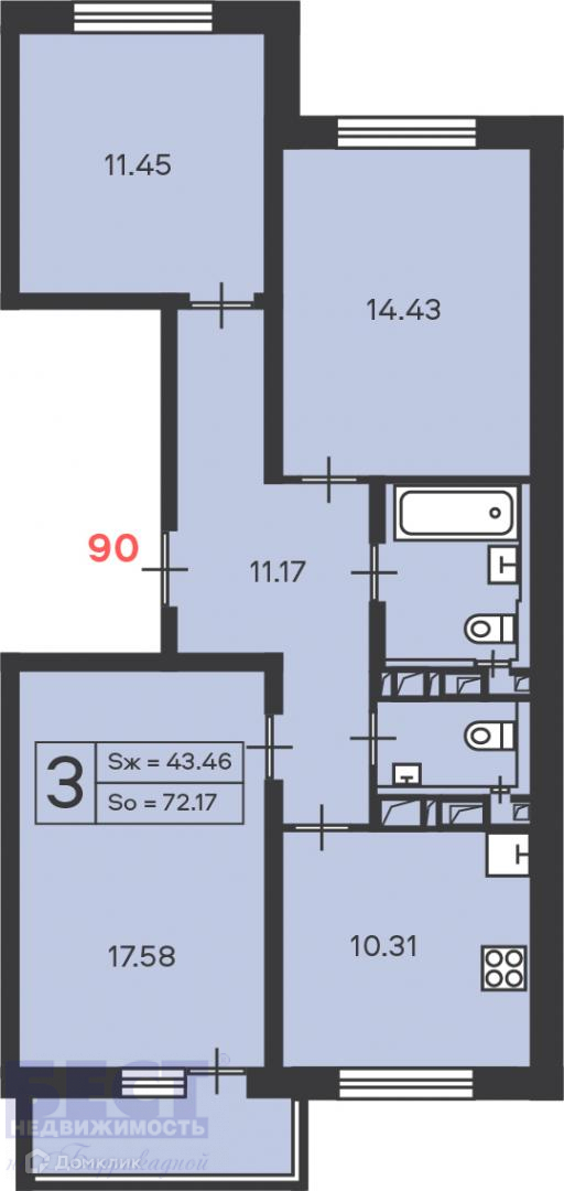 Общая площадь 72.17 м2