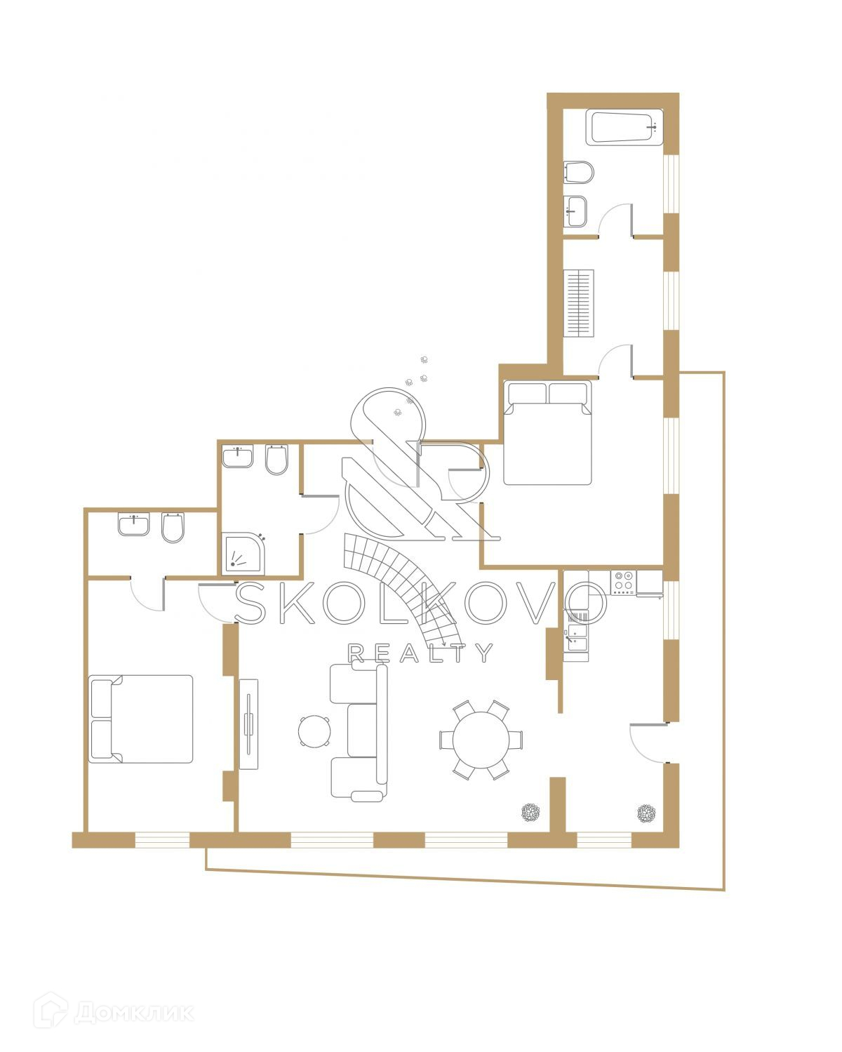 Функциональная планировка позволяет спланировать: кухню, столовую,  гостиную,  до 6 спален. Есть возможность установить камин.