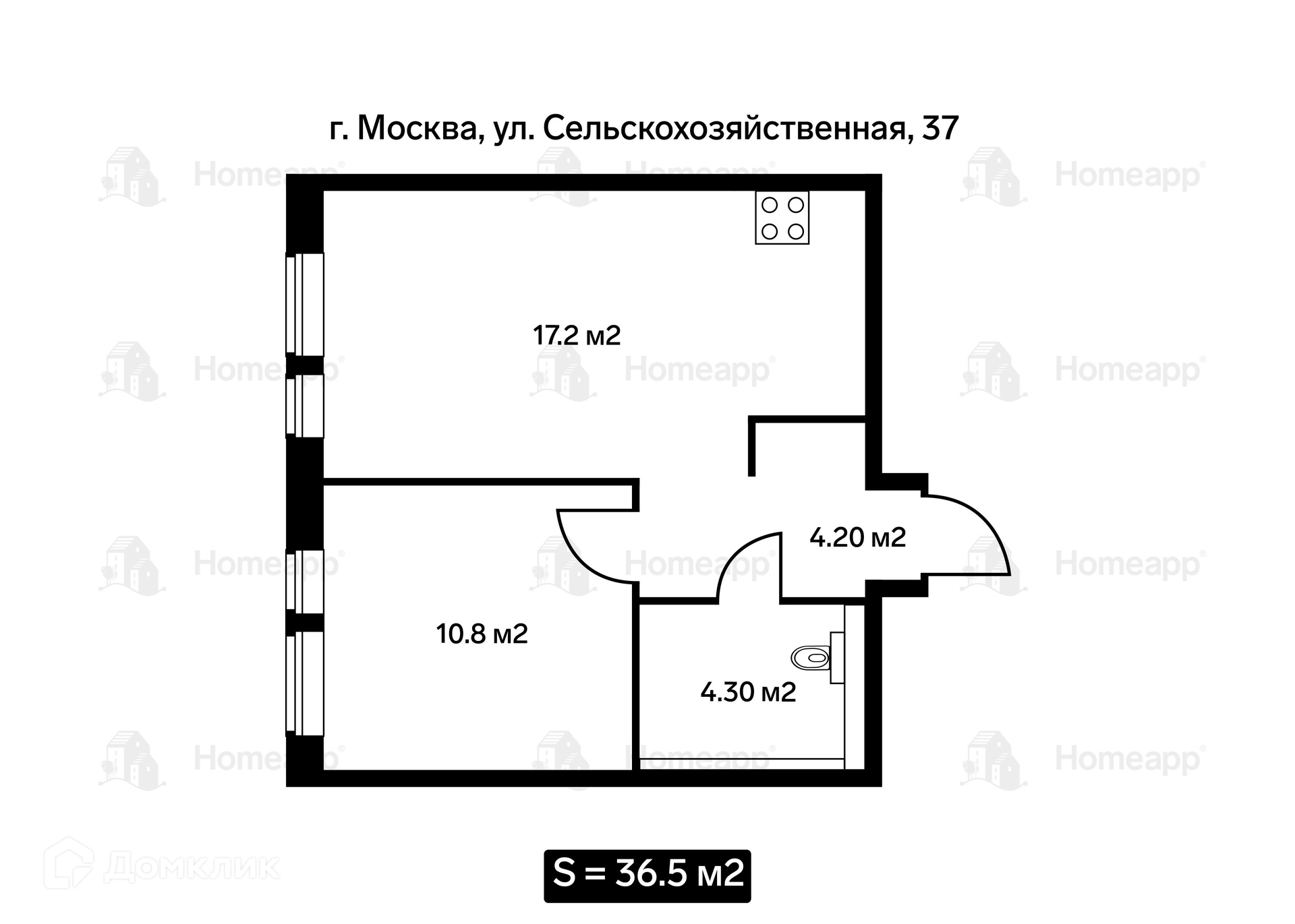 Общая площадь 37 м2