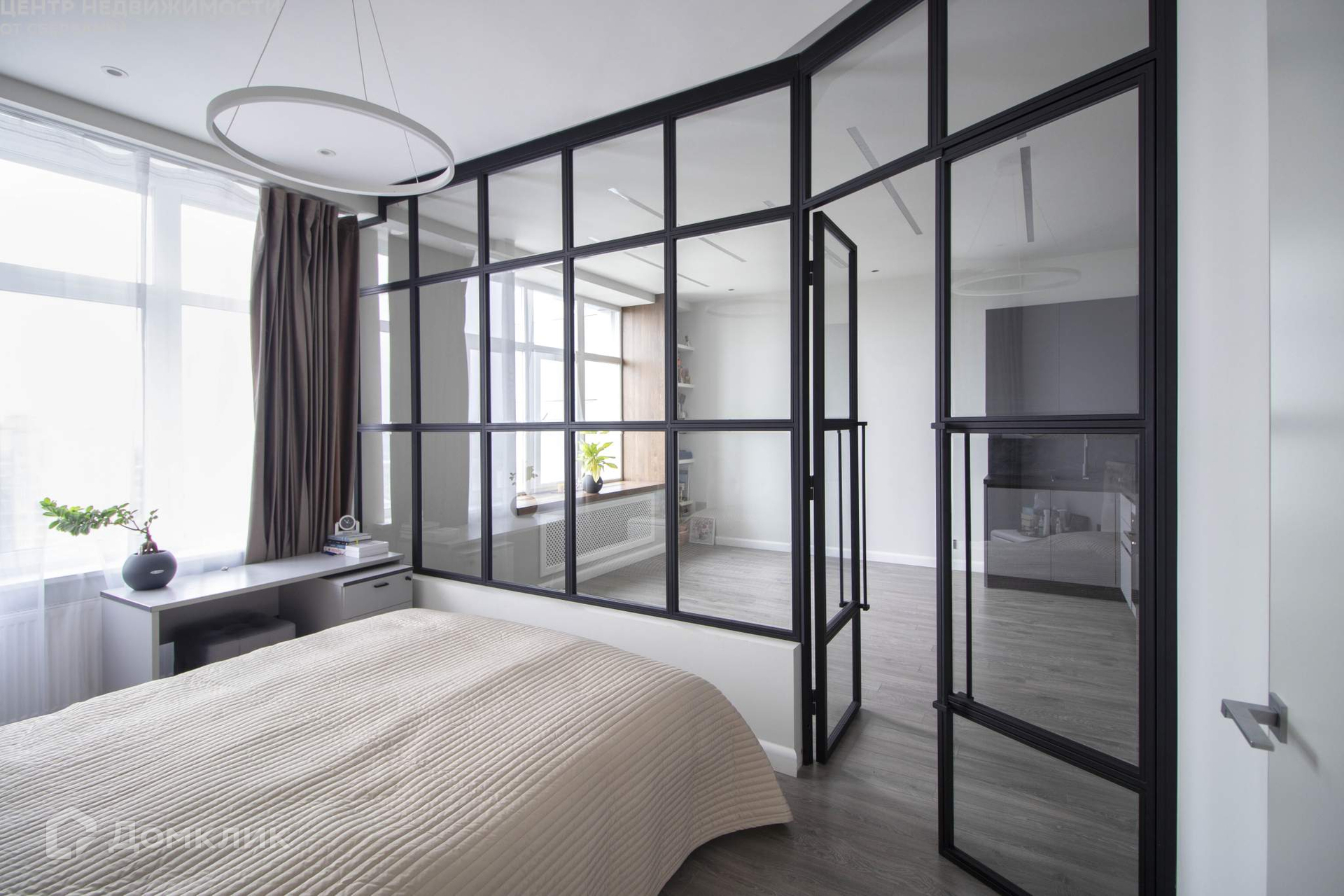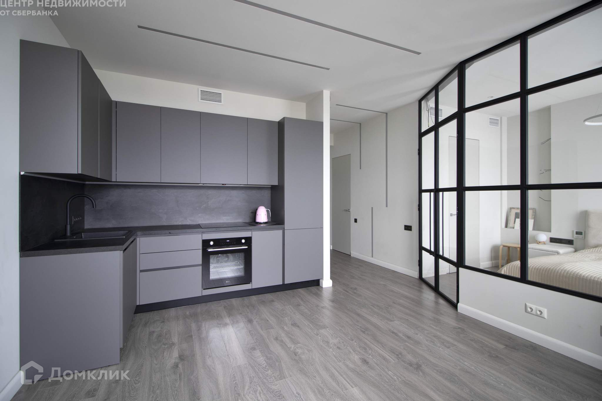 Зона кухни совмещена с гостиной; спальная зона отделена стеклянной перегородкой. Кухня оборудована дорогой техникой - холодильник Liebherr, посудомоечная машина Bosch.