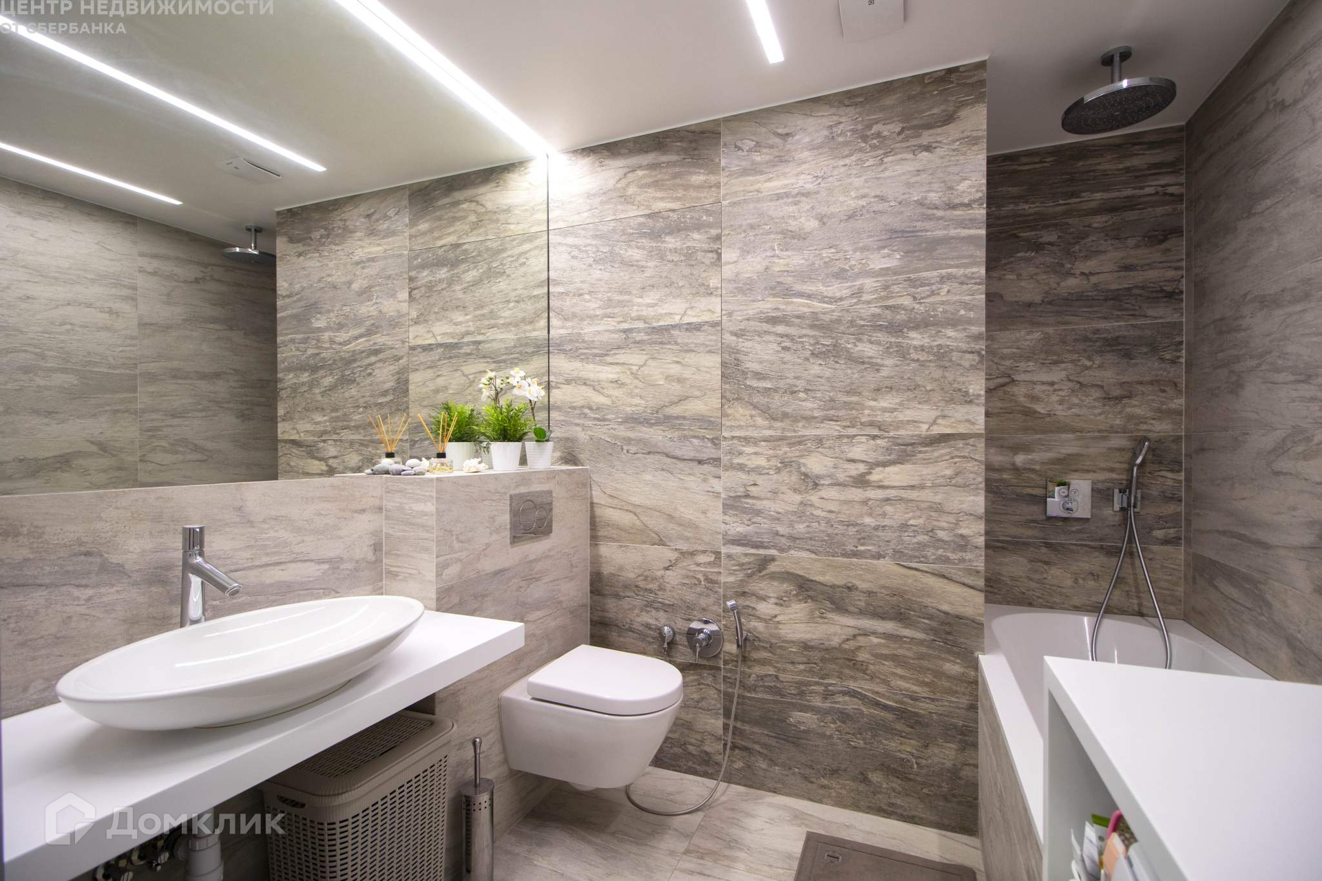 Большая ванная комната (4,5 метра), дорогая итальянская плитка, сантехника Villeroy&Boch, смесители и душевая система Hansgrohe (тропический душ). В санузле установлен бойлер и система защиты от протечек.