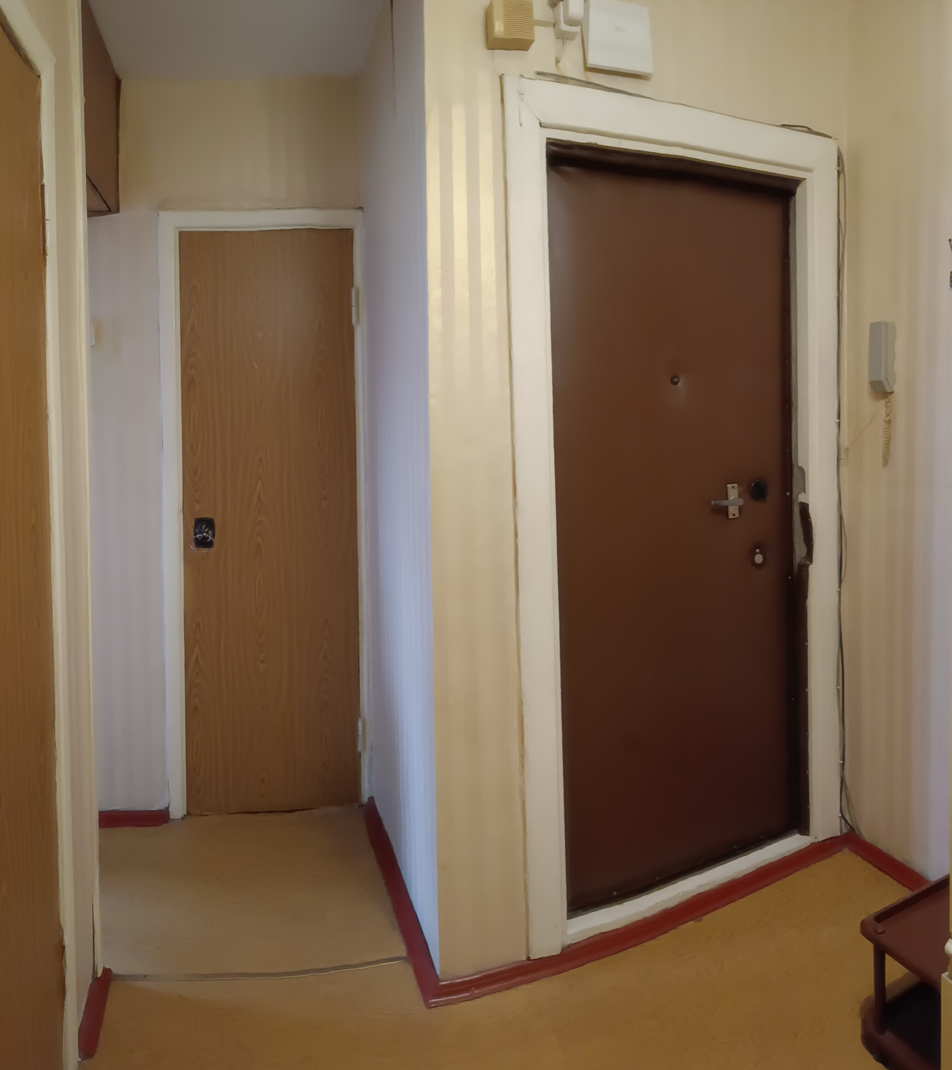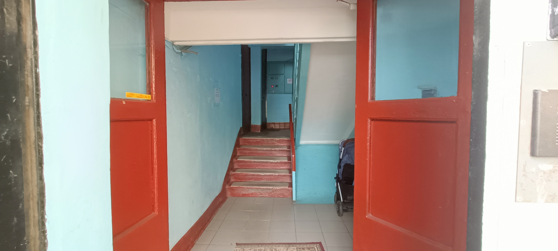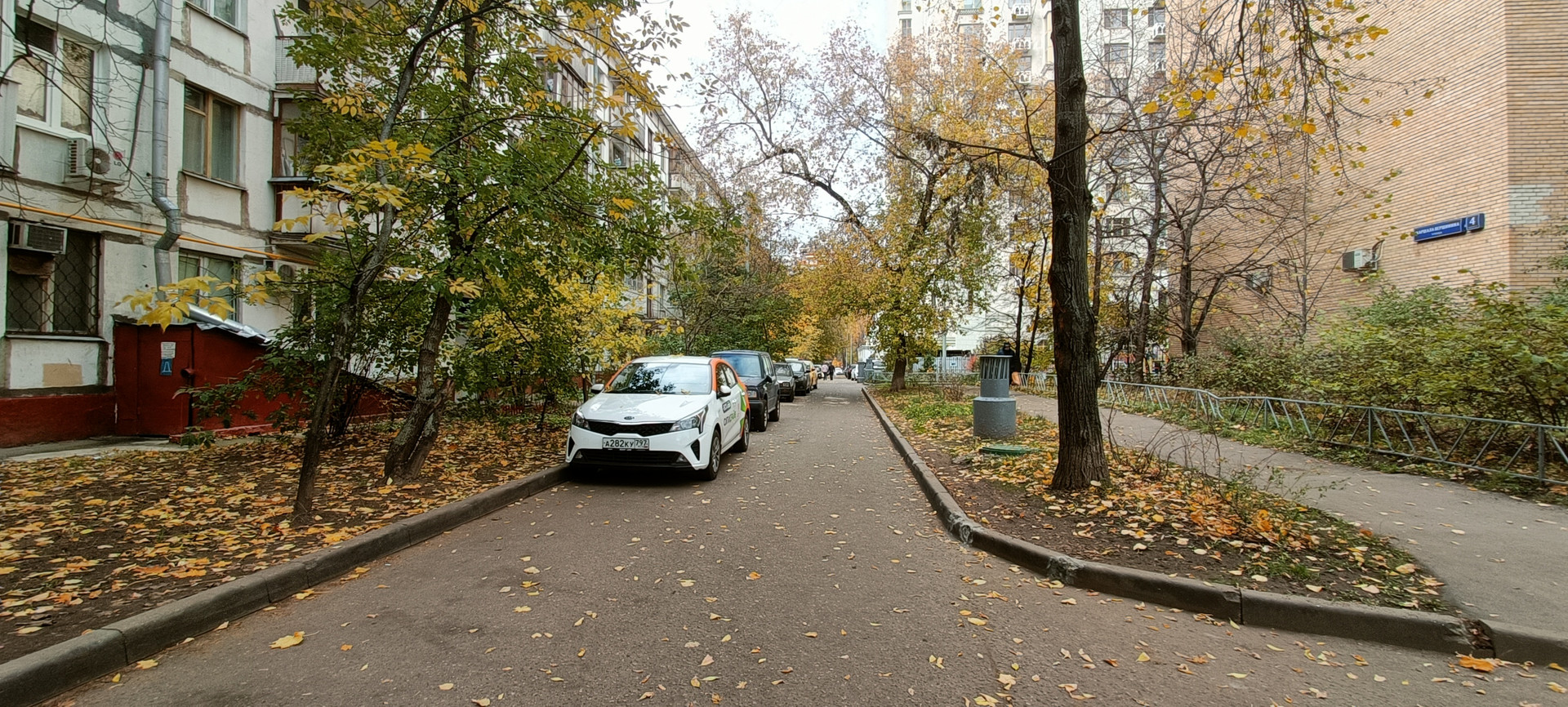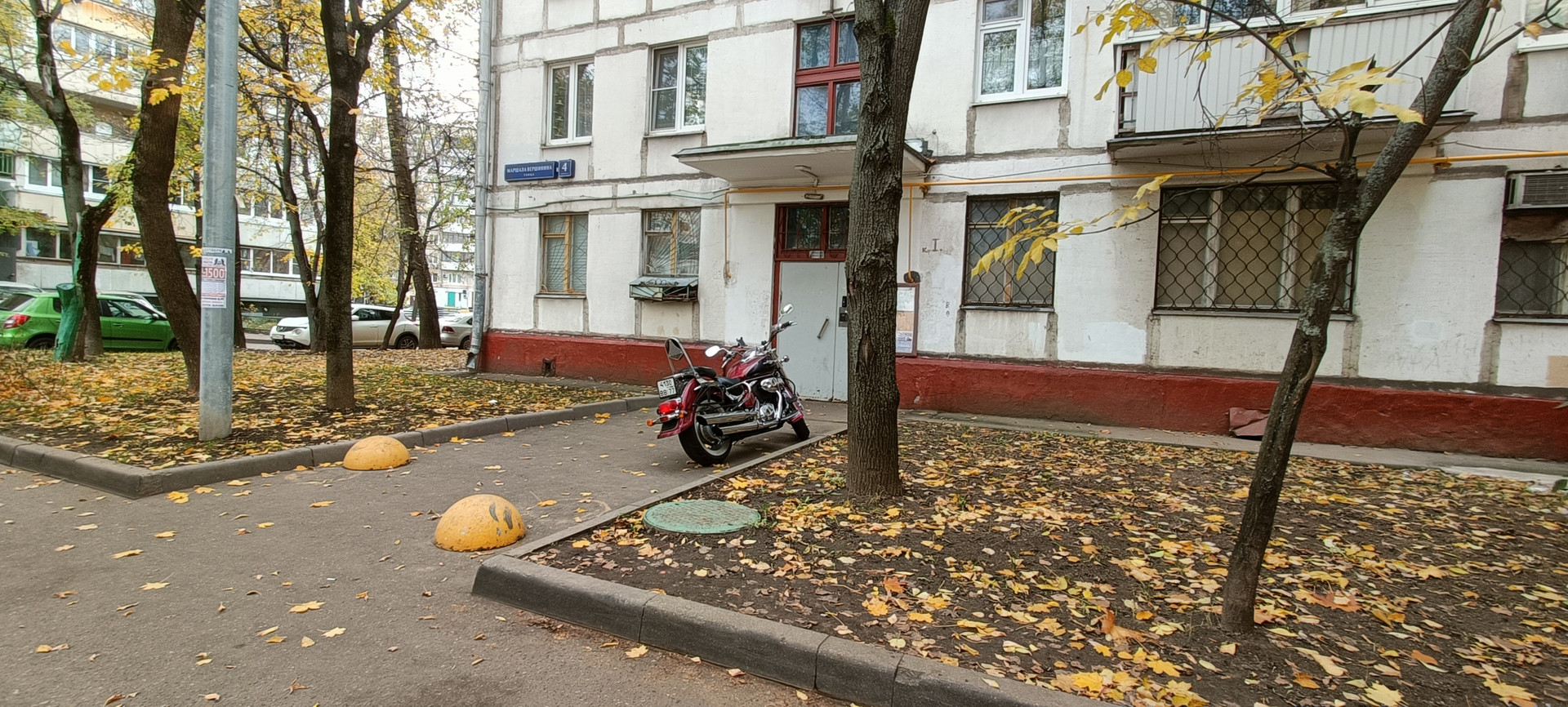 Во дворе много парковочных мест. Входная дверь с домофоном.