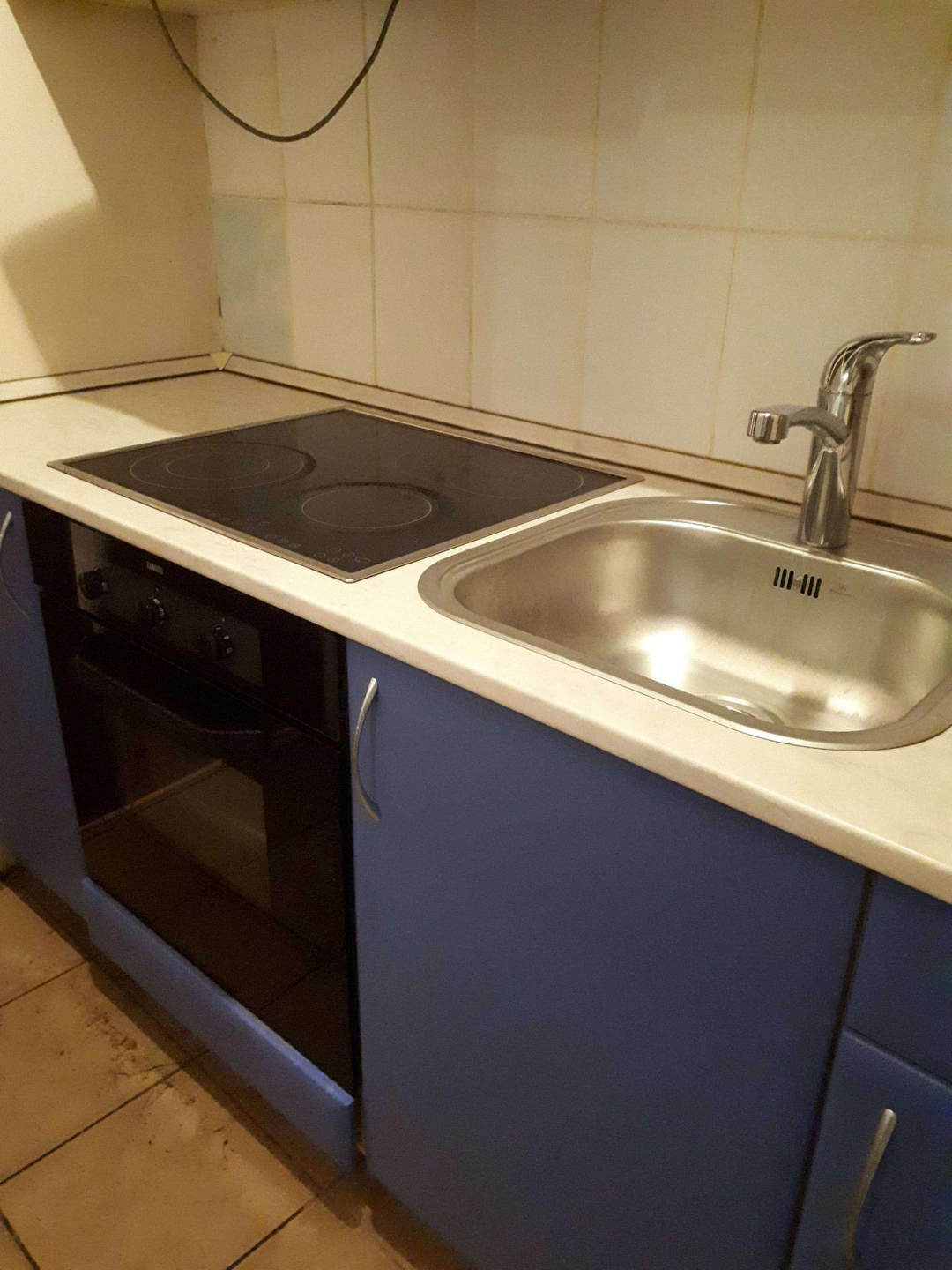 Окно ПВХ, пол ламинат. Кухонный гарнитур, СУС в плитке, душевая кабина.
