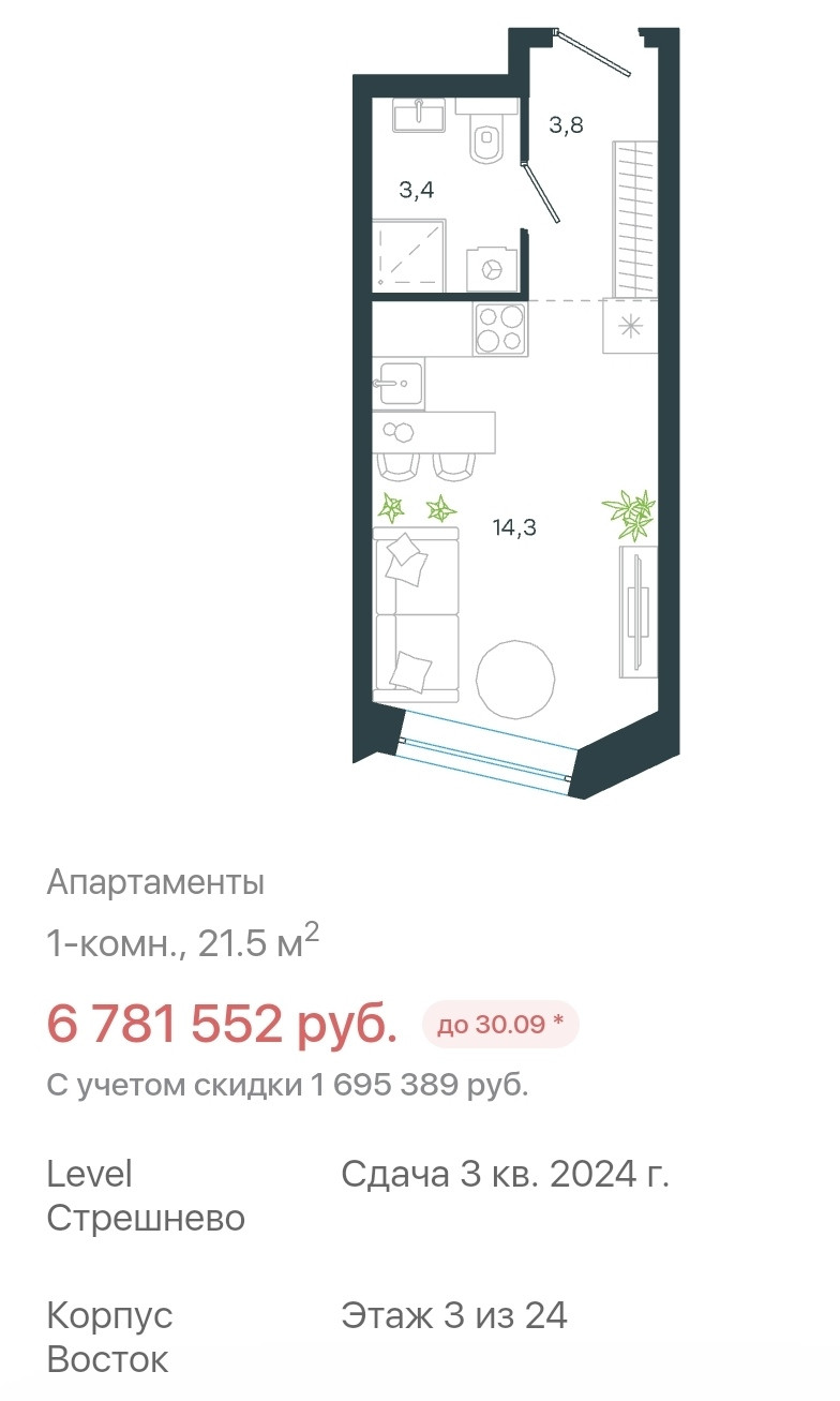 1-комнатная квартира, 22 м2, этаж 3 / 24, на продажу в Москве, Волоколамское шоссе, 81к3